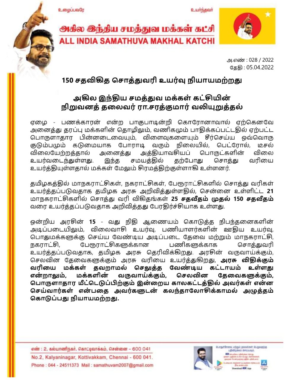 150 சதவிகித சொத்துவரி உயர்வு நியாயமற்றது என அகில இந்திய சமத்துவ மக்கள் கட்சியின் நிறுவனத் தலைவர் ரா.சரத்குமார் வலியுறுத்தி உள்ளார்.