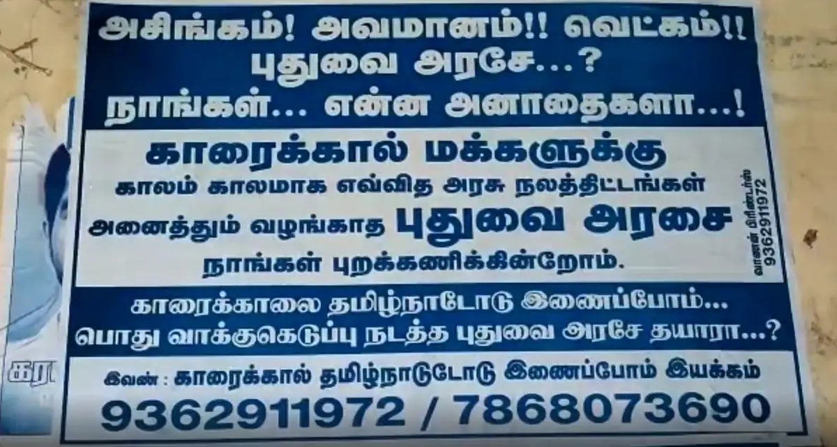 காரைக்கால் மக்களுக்கு காலம் காலமாக எவ்வித அரசு நலத்திட்டங்கள் அனைத்தும் வழங்காத புதுவை அரசை நாங்கள் புறக்கணிக்கின்றோம். காரைக்காலை தமிழ்நாடோடு இணைப்போம்… பொது வாக்குகெடுப்பு நடத்த புதுவை அரசே தயாரா… என காரைக்கால் தமிழ்நாடுடோடு இணைப்போம் இயக்கம் சுவரொட்டி ஒட்டியுள்ளது.
