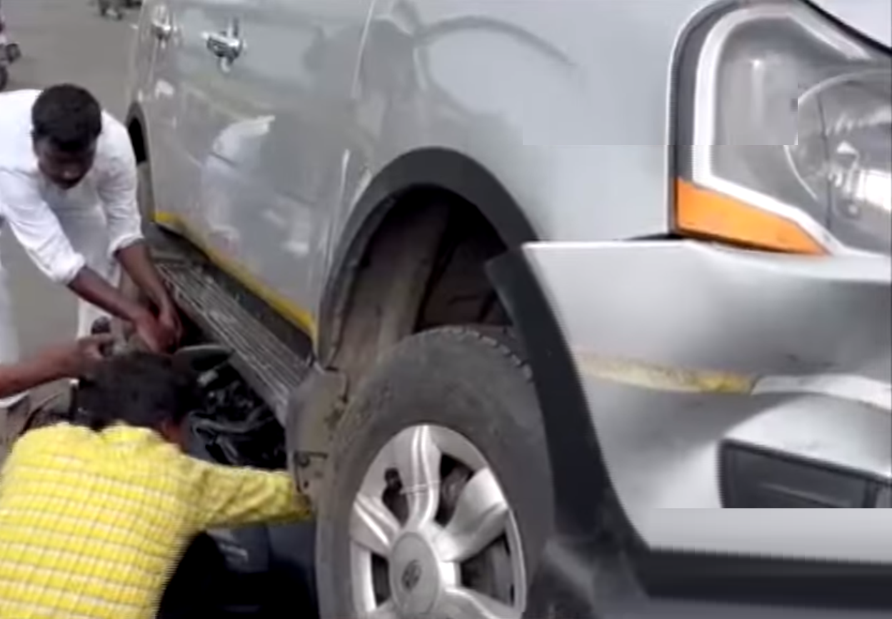 இந்த விபத்தில் கார் பைக் மீது எறியதில், பைக் அப்பளம் போல் நொறுங்கியது. இந்த கொடூரமான விபத்தில் பைக்கில் வந்த இரு இளைஞர்களும் சாலை போக்குவரத்து விதிமுறைகளை பின்பற்றி, நல்ல குடிமகன்களாக ஹெல்மட் அணிந்து வந்ததால் உயிர் தப்பியுள்ளனர்.
