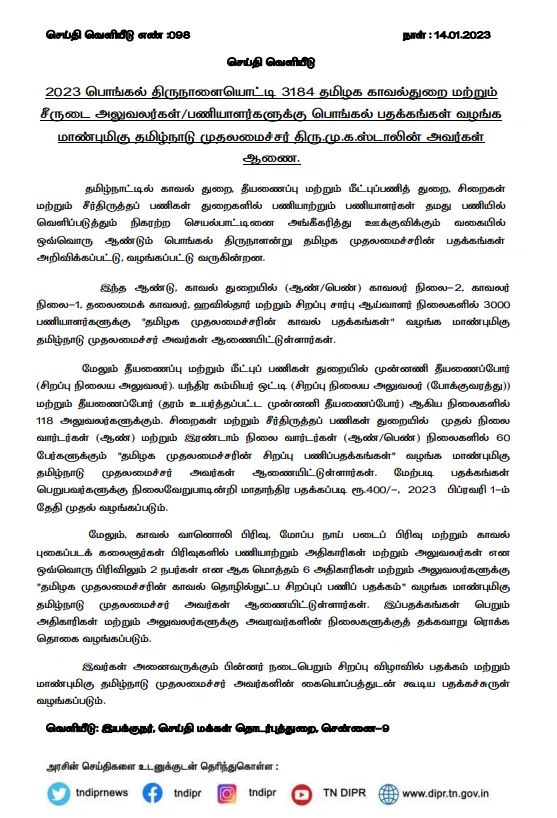 2023 பொங்கல் திருநாளையொட்டி 3184 தமிழக காவல்துறை மற்றும் சீருடை அலுவலர்கள் அல்லது பணியாளர்களுக்கு பொங்கல் பதக்கங்கள் வழங்க தமிழ்நாடு முதலமைச்சர் மு க ஸ்டாலின் அவர்கள் அரசாணை வெளியிட்டுள்ளார்.