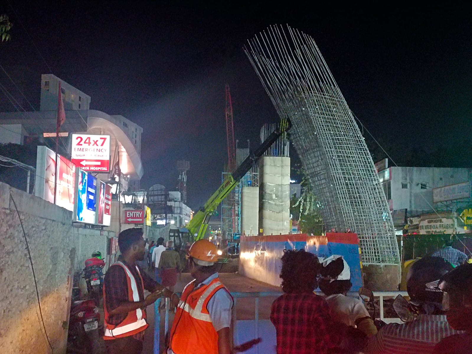 வடபழனி 100 அடி சாலையில் மெட்ரோ பணிகள் நடந்து வரும் நிலையில், இன்று மாலை சுமார் 7 மணியளவில் விஜயா மருத்துவமனை அருகில் ஒரு கட்டுமான பில்லரின் கம்பிகள் சாய்ந்தது.