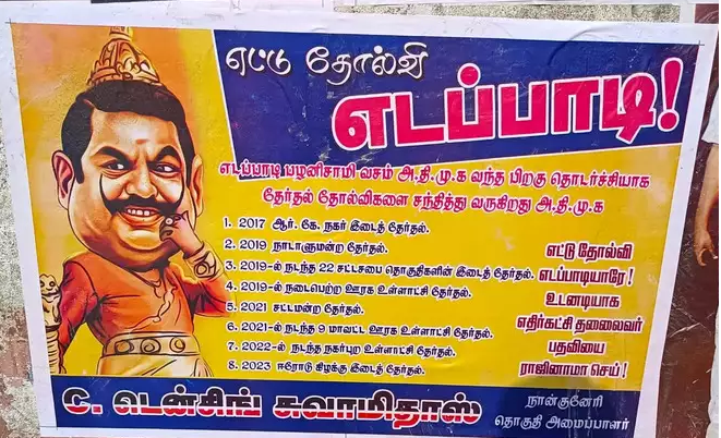 ‘எட்டு தோல்வி எடப்பாடியாரே.. உடனடியாக எதிர்க்கட்சி தலைவர் பதவியை ராஜினாமா செய்!’ என்று குறிப்பிடப்பட்டுள்ளது. மேலும் அந்த எட்டு தேர்தல்கள் விவரமும் சுவரொட்டியில் இடம் பெற்றுள்ளது. தற்போது இந்த சுவரொட்டி சமூக வலைதளங்களில் பரவி பெரும் பரபரப்பை ஏற்படுத்தியுள்ளது.