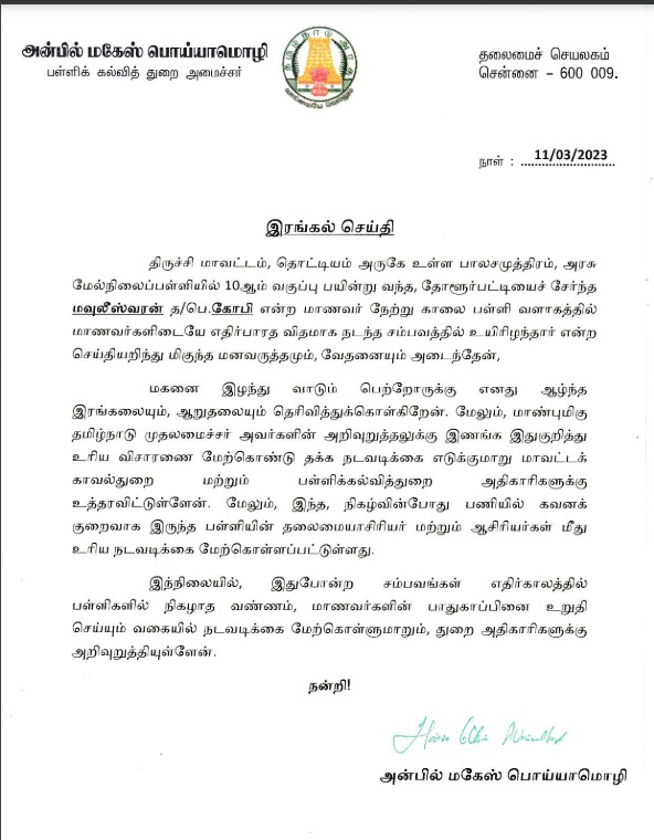 இந்த நிலையில் திருச்சியில் அரசு பள்ளி மாணவர் உயிரிழந்த நிலையில் பள்ளிக்கல்வித்துறை அமைச்சர் அன்பில் மகேஷ் பொய்யாமொழி இரங்கல் தெரிவித்துள்ளார்.