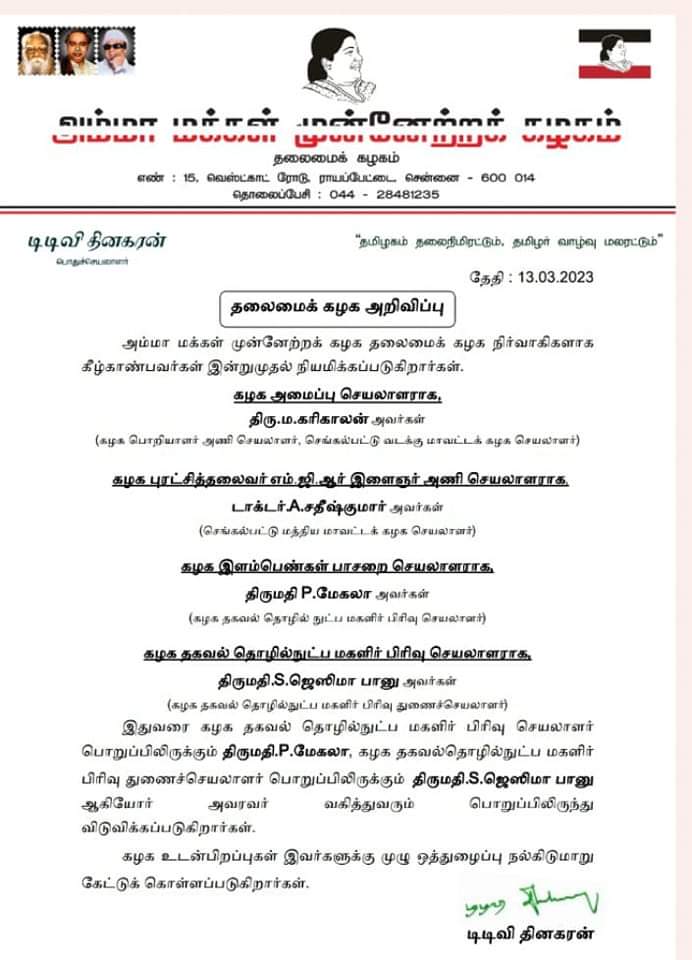 இதுகுறித்த அவரின் அந்த அறிவிப்பில், “அம்மா மக்கள் முன்னேற்றக் கழக தலைமைக் கழக நிர்வாகிகளாக கீழ்காண்பவர்கள் இன்று முதல் நியமிக்கப்படுகிறார்கள்.