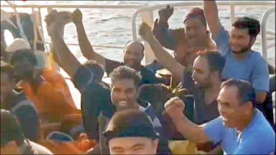 புதுடெல்லி: அரபிக் கடலில் கடத்தப்பட்ட சரக்கு கப்பலில் இருந்த 15 இந்தியர்களை இந்திய கடற்படை கமாண்டோக்கள் பத்திரமாக மீட்டனர். அப்போது உற்சாகத்தில் அவர்கள் ‘பாரத் மாதா கீ ஜே’ என கோஷமிட்டு நன்றி தெரிவித்தனர்.