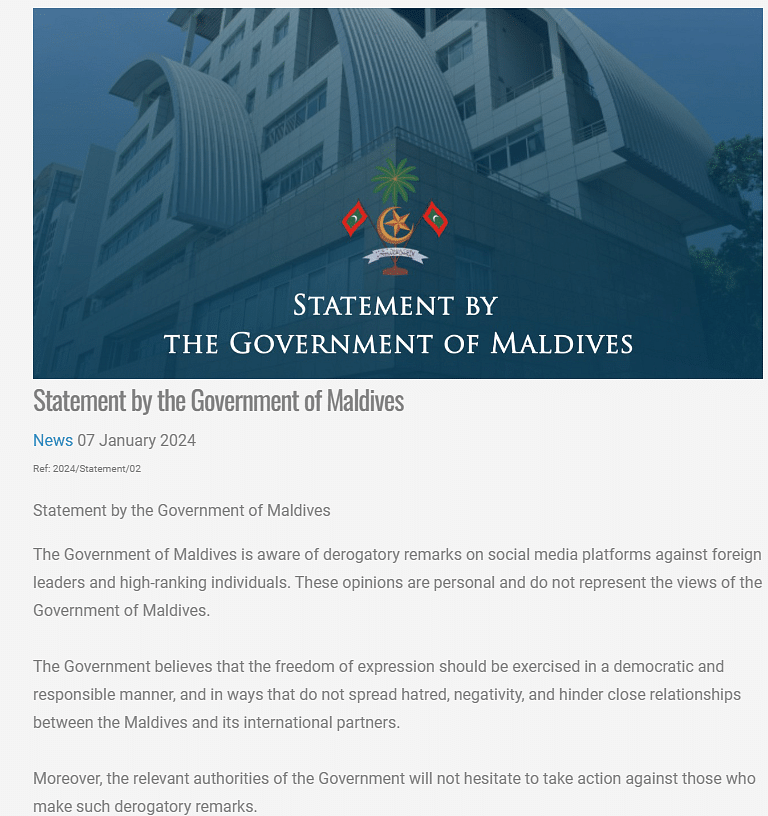 இது குறித்து, மாலத்தீவு அரசு தனது அறிக்கையில், “வெளிநாட்டுத் தலைவர்கள் மற்றும் உயர் பதவியில் இருப்பவர்களுக்கு எதிராக சமூக வளைதளங்களில் தரக்குறைவான கருத்துகள் இருப்பதை மாலத்தீவு அரசாங்கம் கவனித்திருக்கிறது. இந்தக் கருத்துகள் முற்றிலுமாகத் தனிப்பட்டவை. இவை மாலத்தீவு அரசின் கருத்துகளைப் பிரதிநிதித்துவப்படுத்துவதில்லை. மேலும், இது போன்ற கீழ்த்தரமான கருத்துகளை வெளியிடுபவர்கள்மீது நடவடிக்கை எடுக்க அரசின் சம்பந்தப்பட்ட அதிகாரிகள் தயங்க மாட்டார்கள்” என்று தெரிவித்திருக்கிறது.