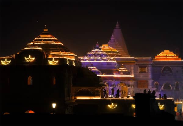 அயோத்தி:அயோத்தியில் ராமர் கோவில் கும்பாபிஷேகம், நாளை கோலாகலமாக நடக்கிறது. பூக்கள், வண்ண விளக்குகளால் அலங்கரிக்கப்பட்டுள்ள ராமர் கோவில், ஒளி வெள்ளத்தில் ஜொலிக்கிறது.