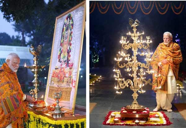 அயோத்தியில் இன்று ராமர் கோயில் கும்பாபிஷேக விழா கோலாகலமாக நடைபெற்றது. இதில் ராமர்கோயில் பிரதமர் மோடி கலந்து கொண்டு பிராண பிரதிஷ்டை செய்து வழிபட்டார். தொடர்ந்து தனது வீட்டில் பால ராமர் படத்திற்கு விளக்கேற்றி, வைத்து அங்கு வைக்கப்பட்டிருந்த பிரமாண்ட விளக்குகளில் தீப ஒளி ஏற்றி வழிபட்டார்.தொடர்ந்து நாடு முழுதும் பிரசித்தி பெற்ற கோயில்களில் விளக்கேற்றப்பட்டது.