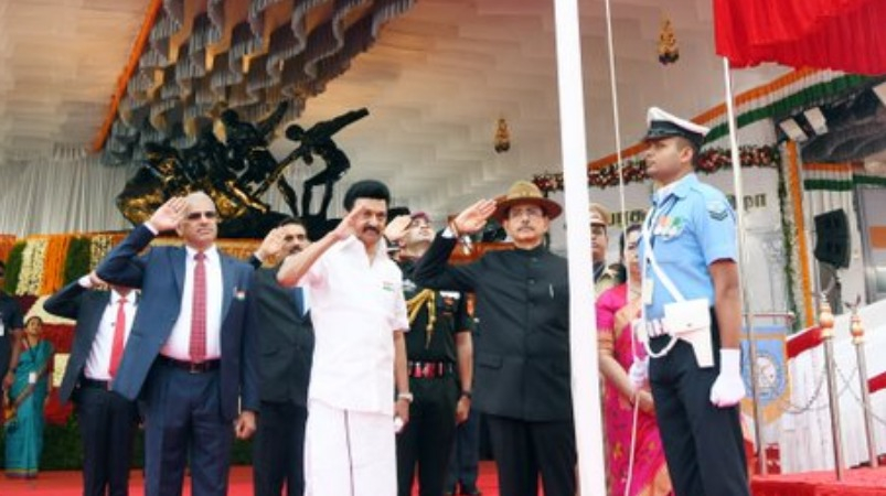 இதைத் தொடர்ந்து, உழைப்பாளர் சிலை பகுதியில் தேசியக் கொடியை ஆளுநர் ஆர்.என்.ரவி காலை 8 மணிக்கு முதல்வர் ஸ்டாலின் முன்னிலையில் ஏற்றிவைத்தார். தேசிய கீதம் இசைக்க, விமானப்படை ஹெலிகாப்டர் மூலம் பூ தூவப்பட்டது. ஆளுநர், முதல்வர், தலைமைச் செயலர் மற்றும் அதிகாரிகள் தேசியக் கொடிக்கு மரியாதை செலுத்தினர்.