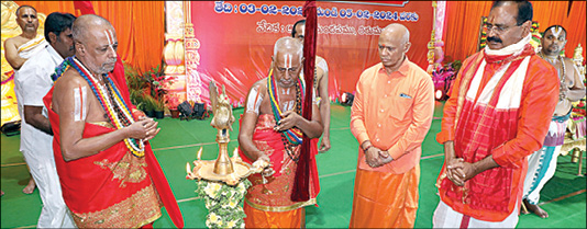 திருமலை: திருமலையில் உள்ள ஆஸ்தான மண்டபத்தில் இந்து தர்ம பிரச்சார பரிஷத் சார்பில் சனாதன தார்மீக கருத்தரங்கு நேற்று தொடங்கியது. வரும் 5-ம் தேதி வரை 3 நாட்கள் நடைபெற உள்ள இந்த கருத்தரங்கில் நாடு முழுவதிலும் இருந்து 25 பீடாதிபதிகள் மற்றும் ஜீயர்கள் பங்கேற்று உள்ளனர். இவர்களுக்கு தேவஸ்தானம் சார்பில் பூரண கும்ப மரியாதை அளிக்கப்பட்டது. அதன் பின்னர் கருத்தரங்கை திருமலை திருப்பதி தேவஸ்தான பெரிய ஜீயர் குத்து விளக்கேற்றி தொடங்கி வைத்தார்.