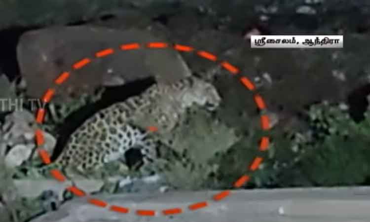 ஆந்திர மாநிலம் ஸ்ரீசைலத்தில் உள்ள பிரசித்தி பெற்ற மல்லிகார்ஜுன சுவாமி கோவில் அருகே மீண்டும் சிறுத்தை நடமாட்டம் தென்பட்டுள்ளது. அடர்ந்த வனப்பகுதிக்கு நடுவே இந்த கோவில் அமைந்துள்ள நிலையில், சில நாட்களுக்கு முன் சத்திரங்கள் அமைந்துள்ள பகுதி அருகே சிறுத்தை நடமாட்டம் தென்பட்டதால் பரபரப்பு ஏற்பட்டது.