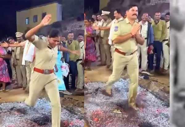 ஐதராபாத்: தெலுங்கானாவில் கோயில் திருவிழாவில் பாதுகாப்பு வந்த போலீசார் சீருடையுடன் தீ மிதி விழாவில் பங்கேற்று பூக்குழி இறங்கிய புகைப்படம், வீடியோ வைரலாகி வருகிறது.