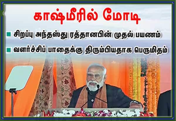 வரலாற்று சிறப்புமிக்க அந்த நிகழ்வுக்கு பின், பிரதமர் மோடி நேற்று காஷ்மீருக்கு முதல்முறையாக வருகை தந்தார். மாநிலத்தின் சுற்றுலா, வேளாண் பொருளாதார வளர்ச்சியை மையமாகக் கொண்ட 5,000 கோடி ரூபாய்க்கான திட்டங்களை துவக்கி வைத்தார். இதில் சுற்றுலா வளர்ச்சி திட்டங்களுக்கு மட்டும் 1,400 கோடி ரூபாய் செலவிடப்படும். அரசுப் பணியில் நியமிக்கப்பட்டுள்ள 1,000 பேருக்கான பணி நியமன ஆணையை பிரதமர் வழங்கினார். மத்திய அரசின் பல்வேறு வளர்ச்சி திட்ட பயனாளர்கள், பெண்கள், விவசாயிகள் மற்றும் தொழில்முனைவோருடன் கலந்துரையாடினார்.