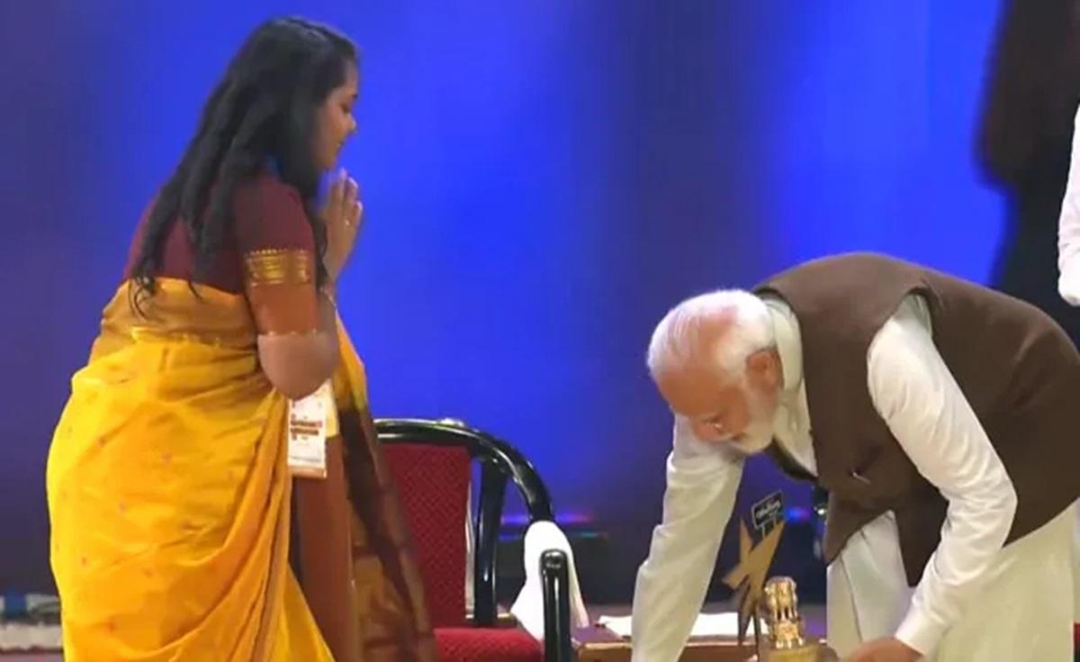 டெல்லியில் சிறந்த கதை சொல்லிபிரிவுக்கான விருது பெறுவதற்காக தமிழ்நாட்டை சேர்ந்தகீர்த்திகா கோவிந்தசாமி மேடைஏறியதும் பிரதமர் மோடியின் பாதத்தை தொட்டு வணங்கினார். அப்போது பிரதமர் மோடி, காலில் விழக்கூடாது என்றுஅறிவுறுத்தினார். அதேநேரம் கீர்த்திகாவின் பாதத்தை அவர் 3 முறை தொட்டு வணங்கினார். பின்னர் விழா மேடையில் இருவரின் உரையாடல் விவரம்: