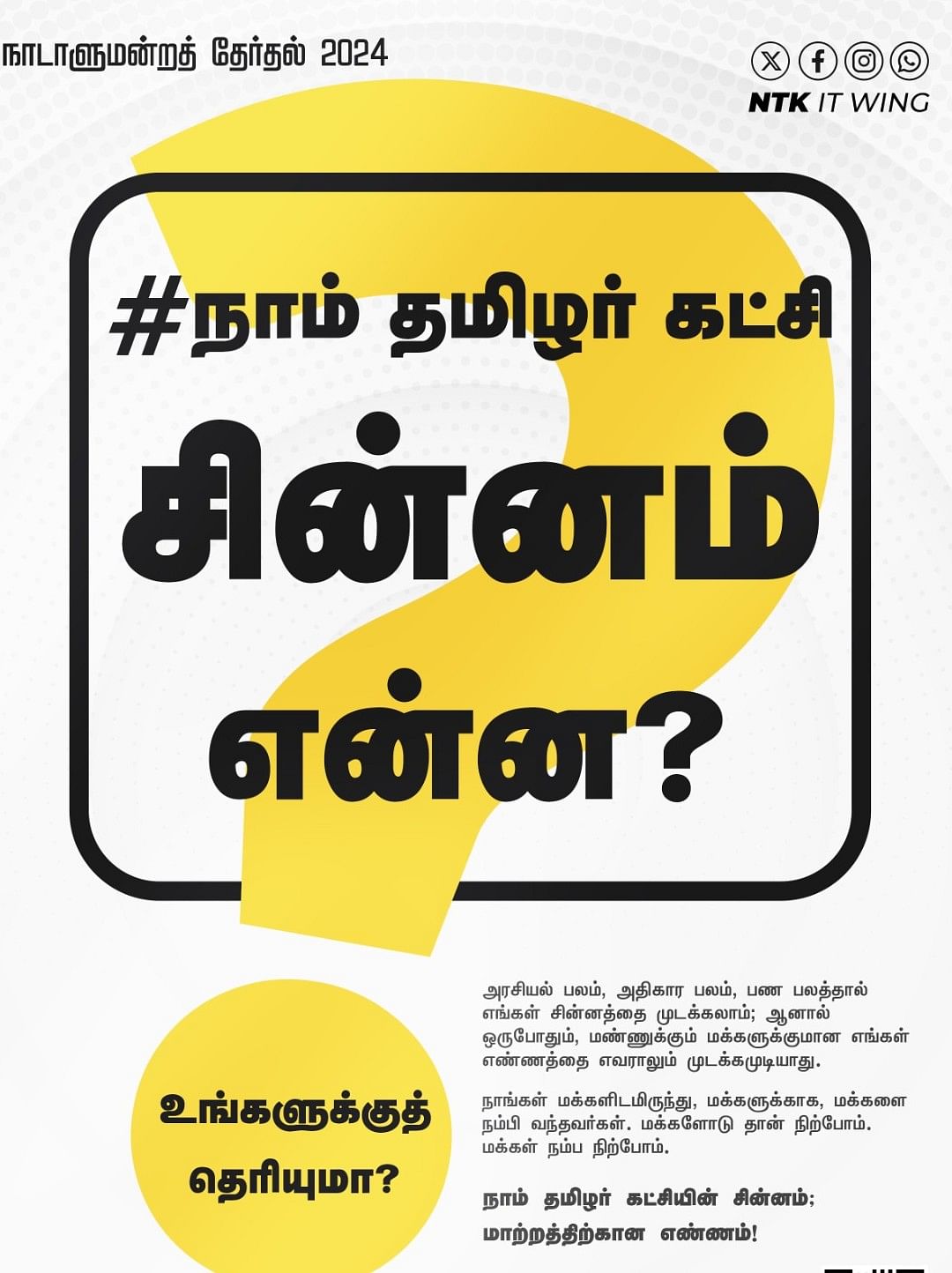 அதன் பகுதியாகவே ‘நாம் தமிழர் கட்சியின் சின்னம் என்ன?” என்ற பிரசாரத்தை தமிழ்நாடு முழுக்க மேற்கொண்டிருக்கிறோம். 40 தொகுதிகளிலும் சுவர் விளம்பரம், போஸ்டர்களாக மக்கள் மத்தியில் ஒரு வினாவை கேட்க செய்திருக்கிறோம். அதோடு ட்விட்டர் உள்ளிட்ட சமூக வலைதளங்களிலும் தொடர்ந்து இக்கேள்வியை பேசுபொருளாக மாற்றியிருக்கிறோம். நா.த.க-வுக்கு புதுச் சின்னம் ஒதுக்கப்படும்வரை இப்பிரசாரத்தை இன்னும் விரியமாக கொண்டு செல்லவிருக்கிறோம். கட்சி நிர்வாகிகளின் குடும்பத்தினர், குழந்தைகள் `நாம் தமிழர் கட்சியின் சின்னம் என்ன?’ என வீடியோக்களை சமூக வலைதளங்களில் பகிர்ந்து வருகிறார்கள். சொல்லப்போனால் இதெல்லாம் வெறும் ட்ரெயிலர்தான்.