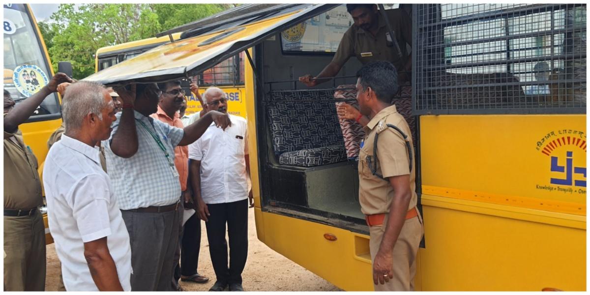 108 ஆம்புலன்ஸ் குழுவை சேர்ந்த ஆ.முத்துலட்சுமி மற்றும் ஆர்.ஜெகதீஷ்வரன் ஆகிய அடங்கிய குழுவினர் விபத்து ஏற்பட்டால் செய்யக்கூடிய முதலுதவி குறித்தும் ஓட்டுநர்களின் உடல் தகுதி பராமரிப்பு குறித்தும் எடுத்துரைத்தனர். தொடர்ந்து பள்ளி வாகனங்களை வட்டாரப் போக்குவரத்து அலுவலர் கு.நெடுஞ்செழியப்பாண்டியன், வட்டாட்சியர் சரவண பெருமாள், பள்ளி கல்வி துறை துணை ஆய்வாளர் என்.கே.ரமேஷ், மோட்டார் வாகன ஆய்வாளர் எஸ்.சுரேஷ் விஸ்வநாத் ஆகியோர் அடங்கிய குழுவினர் ஆய்வு செய்தனர்.