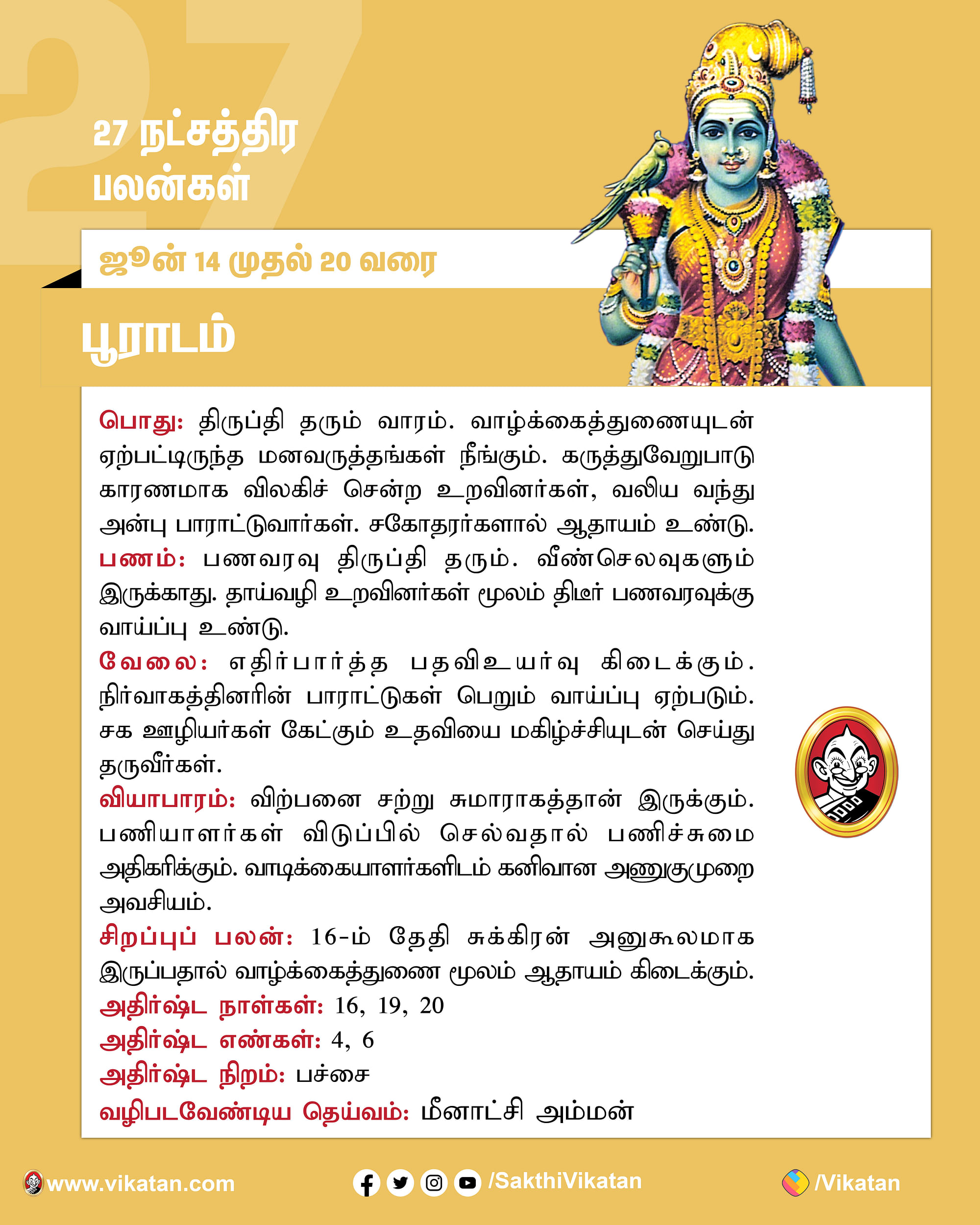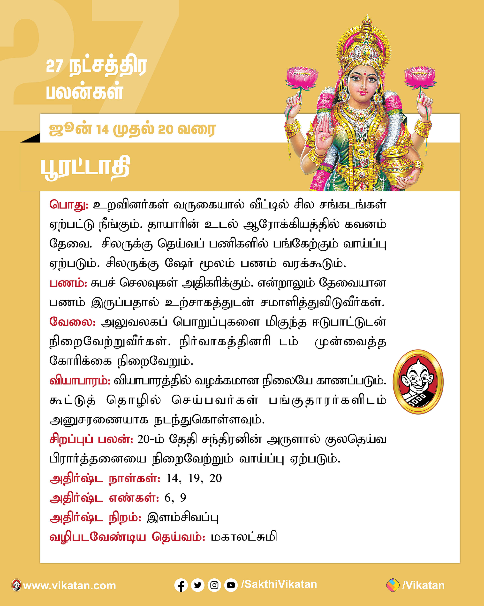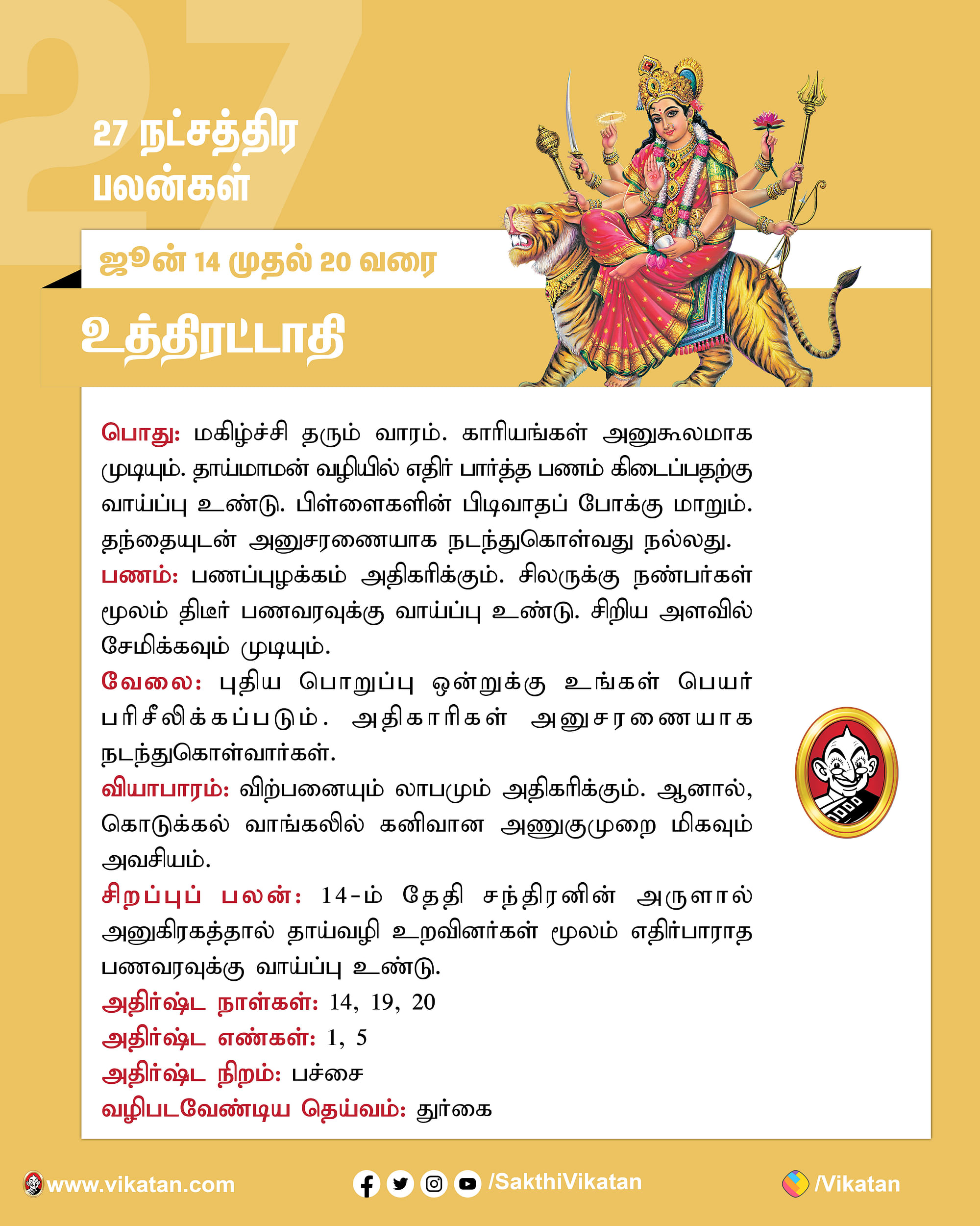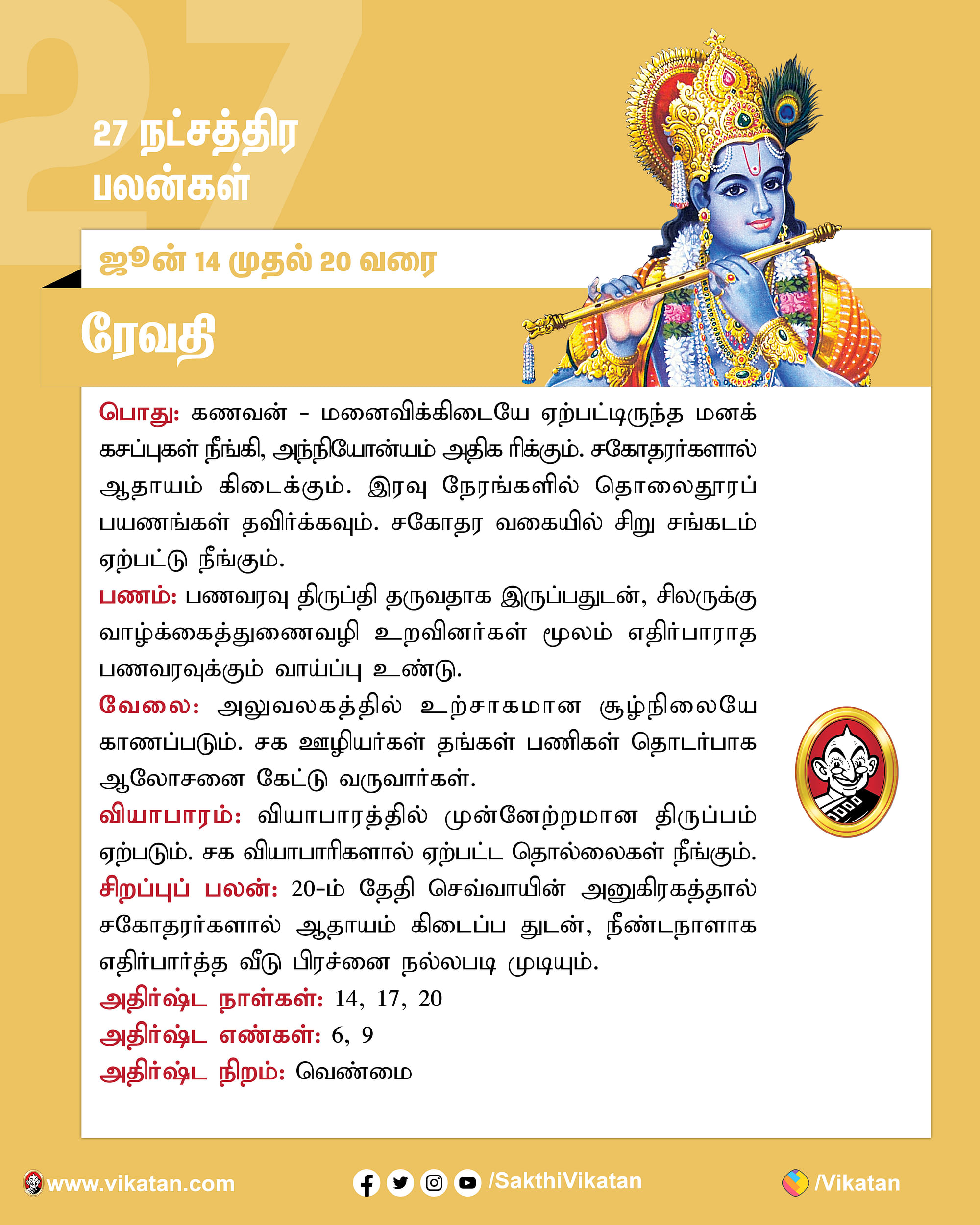 நட்சத்திரப் பலன்கள்: ஜூன் 14 முதல் 20 வரை #VikatanPhotoCards June 14, 2024 by விகடன் அசுவினி பரணி கிருத்திகை ரோகிணி மிருகசீரிடம் திருவாதிரை புனர்பூசம் பூசம் ஆயில்யம் மகம் பூரம் உத்திரம் அஸ்தம் சித்திரை சுவாதி விசாகம் அனுஷம் கேட்டை மூலம் பூராடம் உத்திராடம் திருவோணம் அவிட்டம் சதயம் பூரட்டாதி உத்திரட்டாதி ரேவதி Source link
