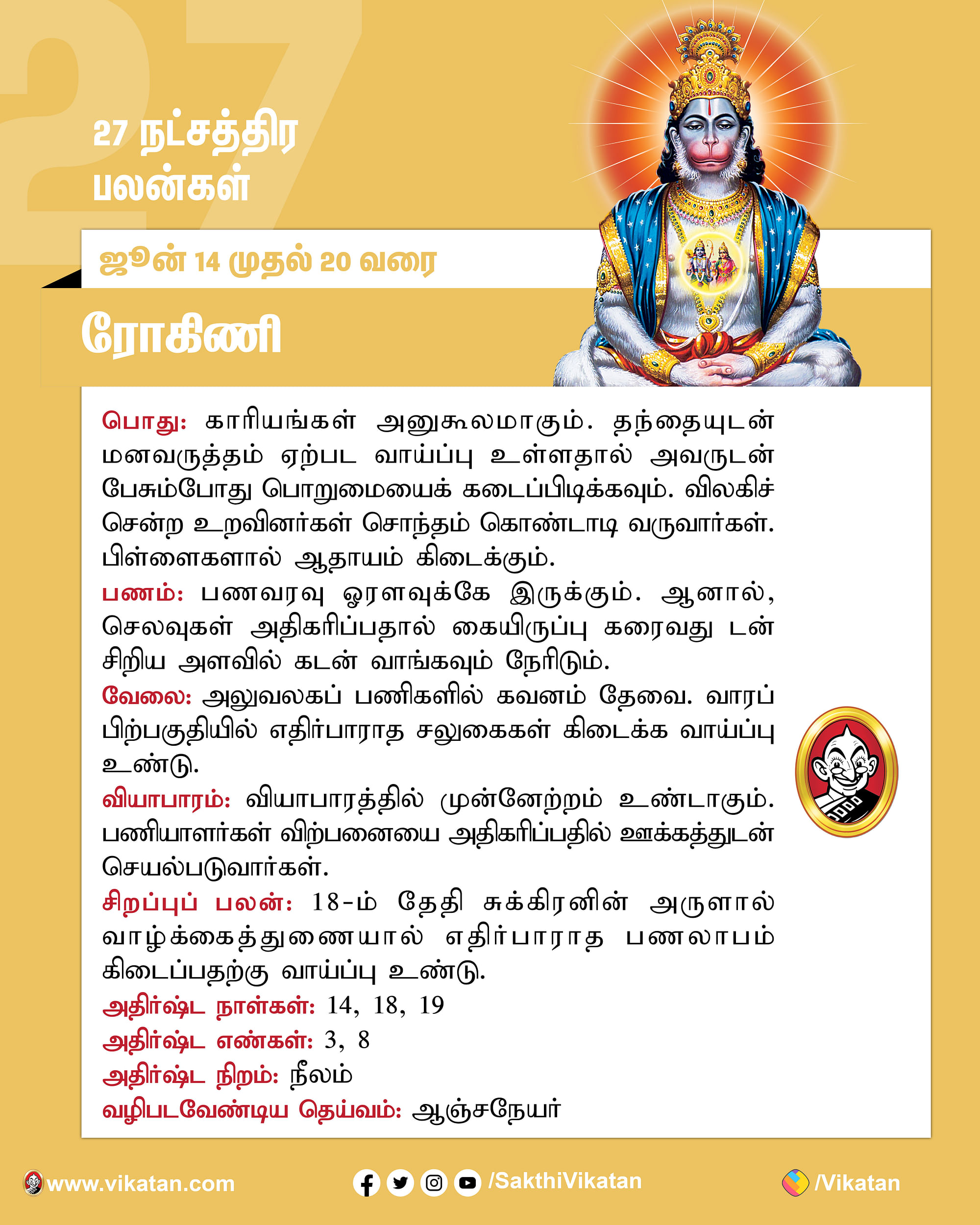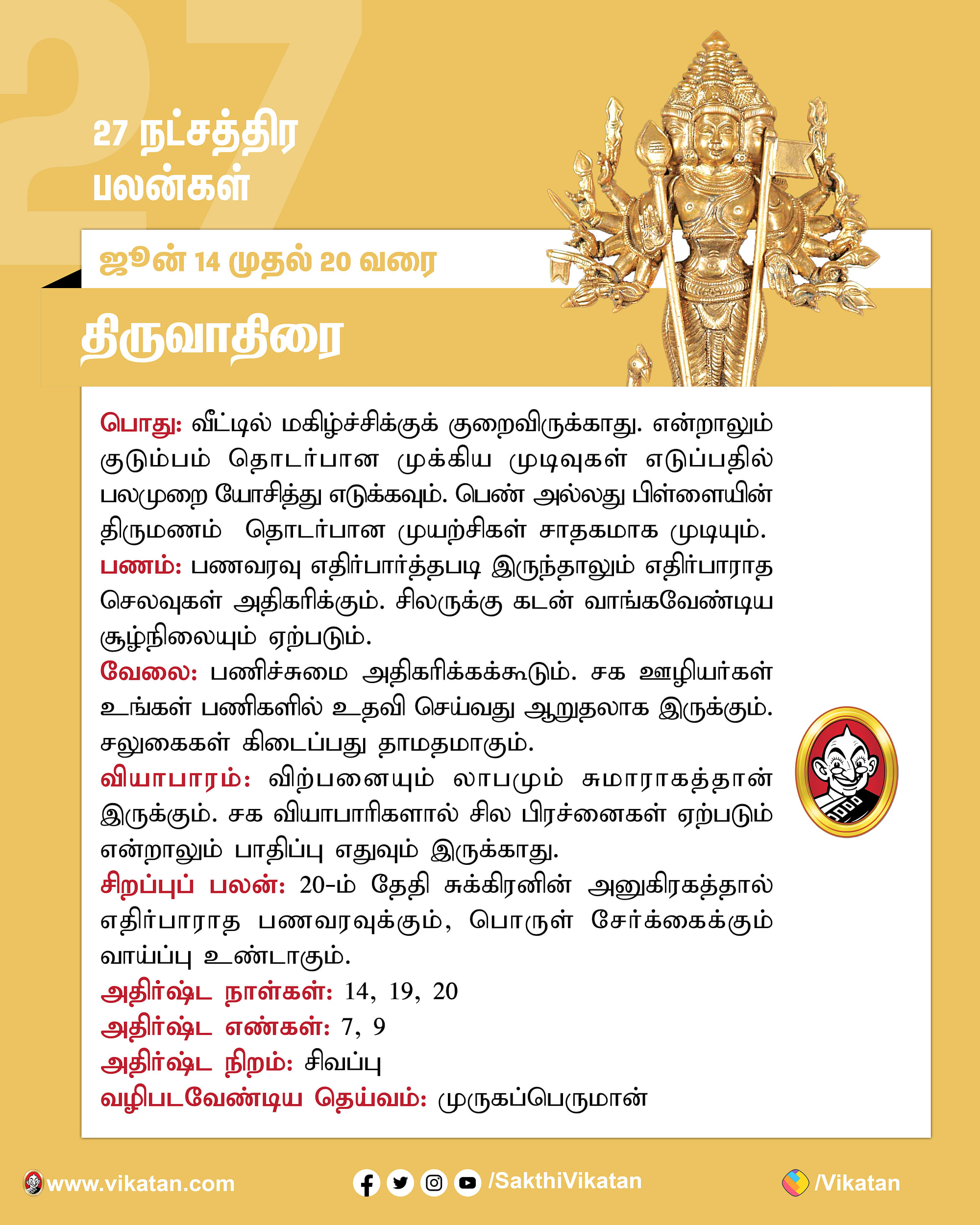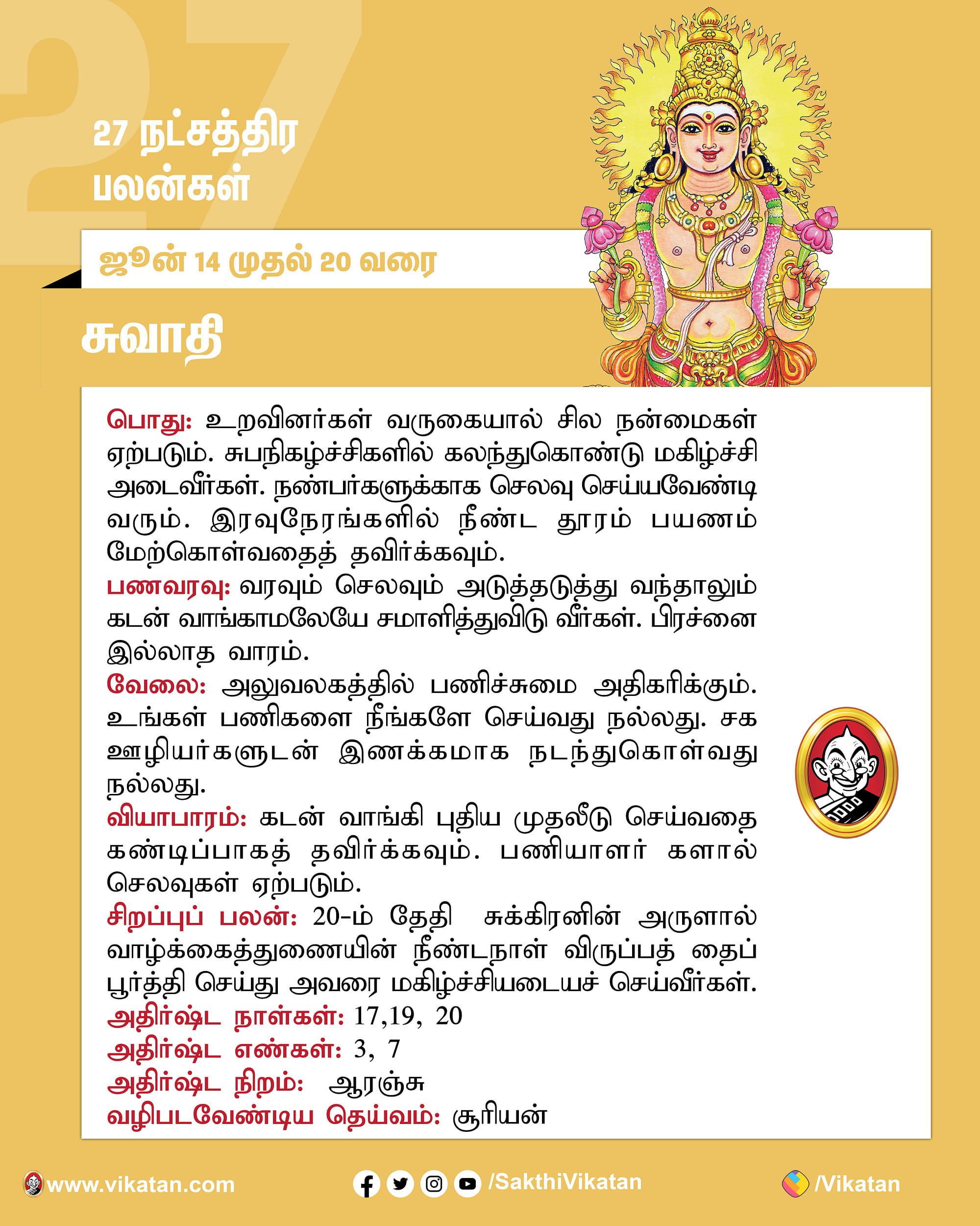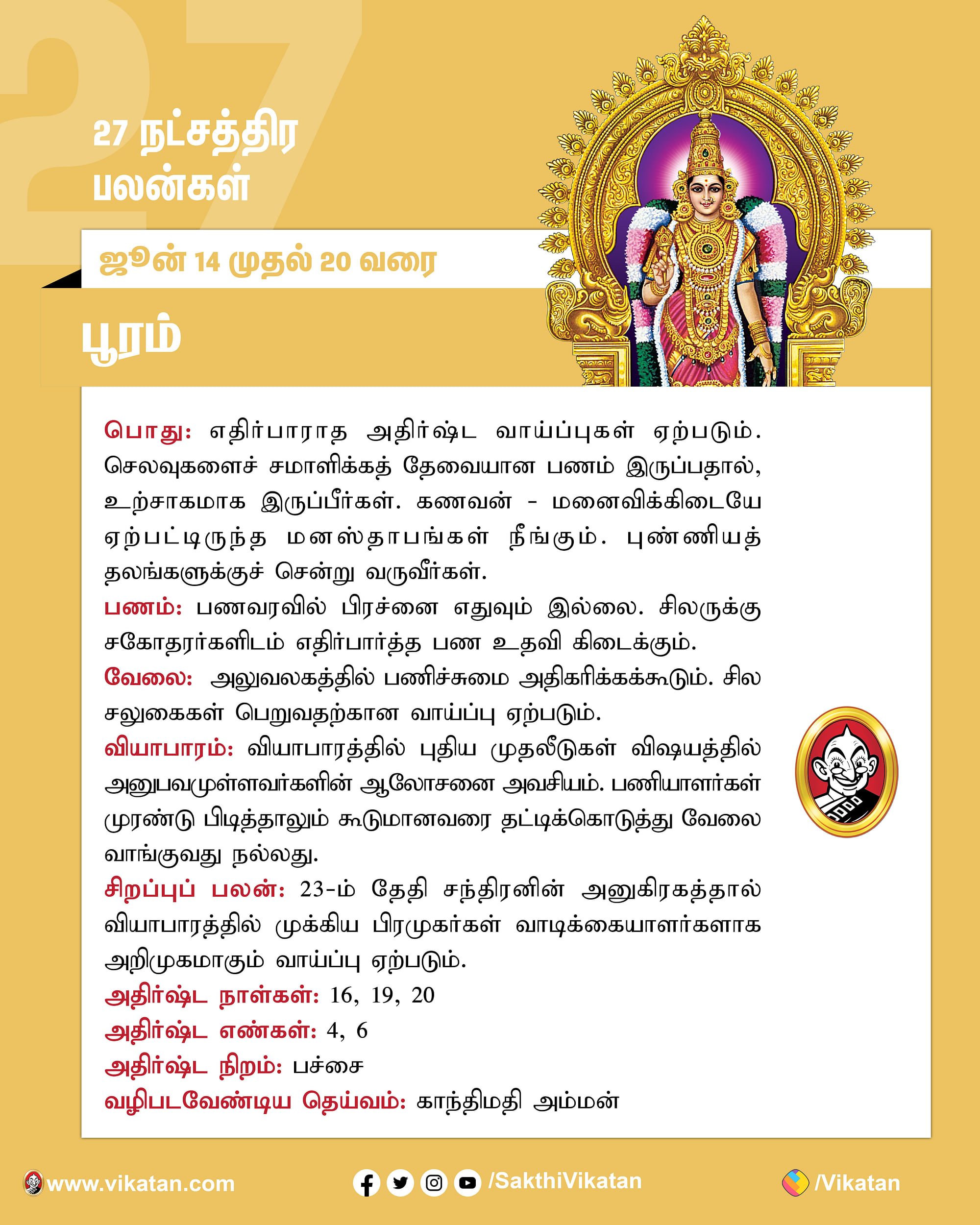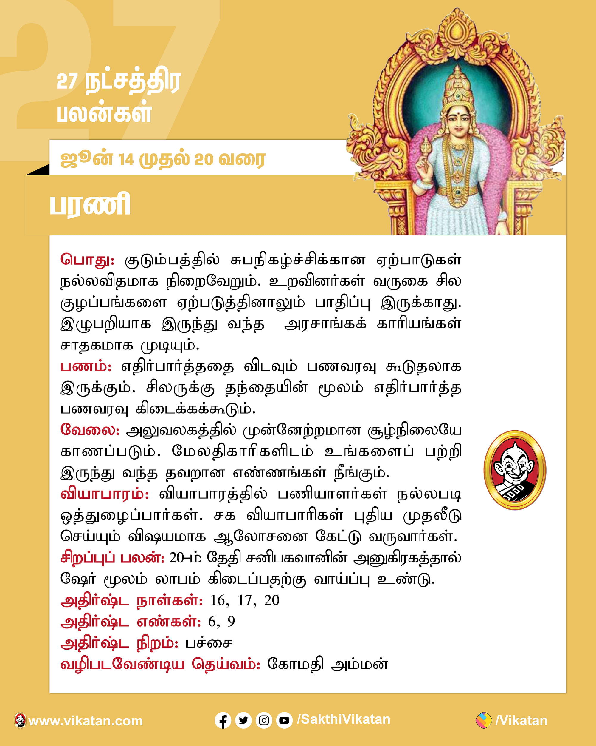 நட்சத்திரப் பலன்கள்: ஜூன் 14 முதல் 20 வரை #VikatanPhotoCards June 14, 2024 by விகடன் அசுவினி பரணி கிருத்திகை ரோகிணி மிருகசீரிடம் திருவாதிரை புனர்பூசம் பூசம் ஆயில்யம் மகம் பூரம் உத்திரம் அஸ்தம் சித்திரை சுவாதி விசாகம் அனுஷம் கேட்டை மூலம் பூராடம் உத்திராடம் திருவோணம் அவிட்டம் சதயம் பூரட்டாதி உத்திரட்டாதி ரேவதி Source link
