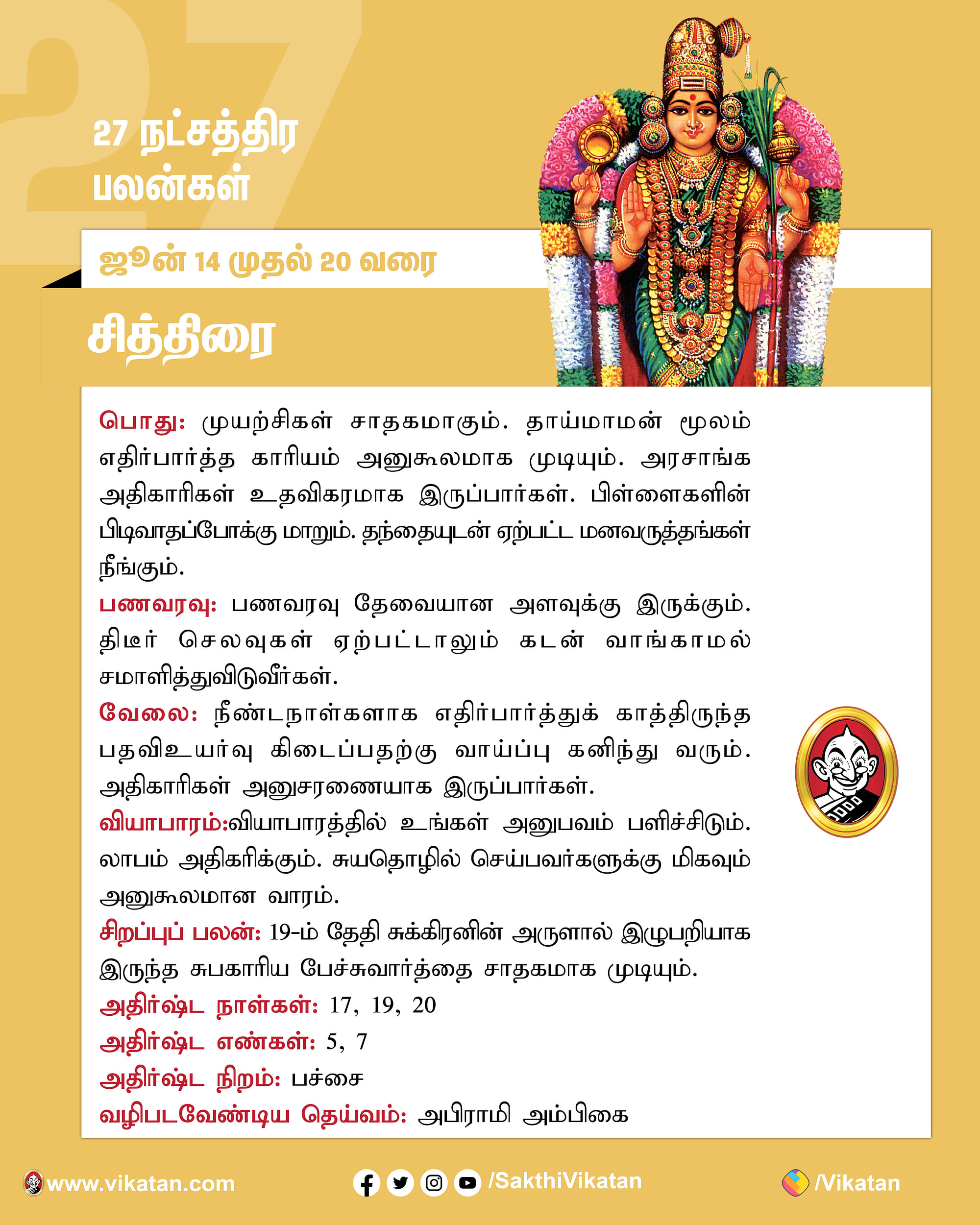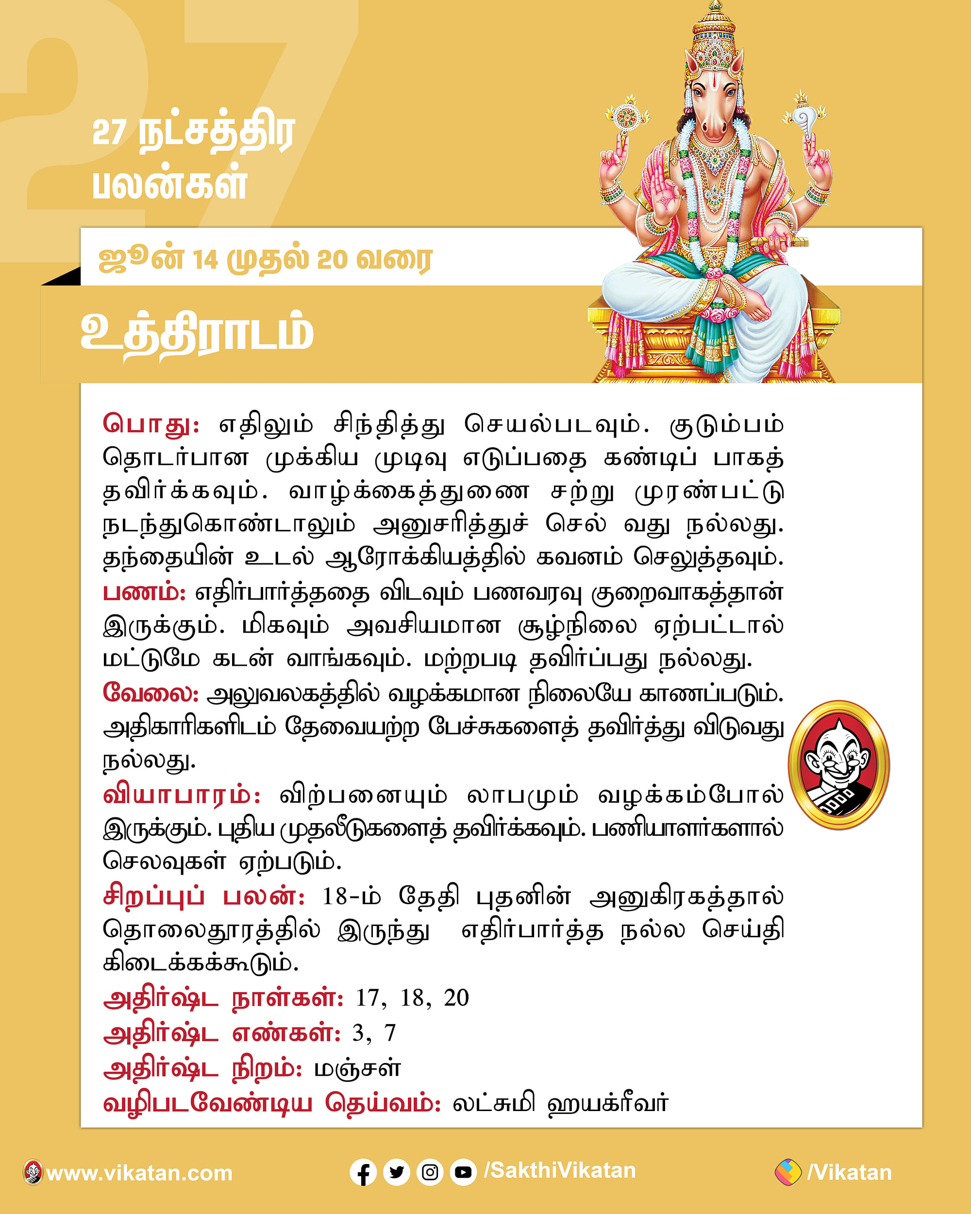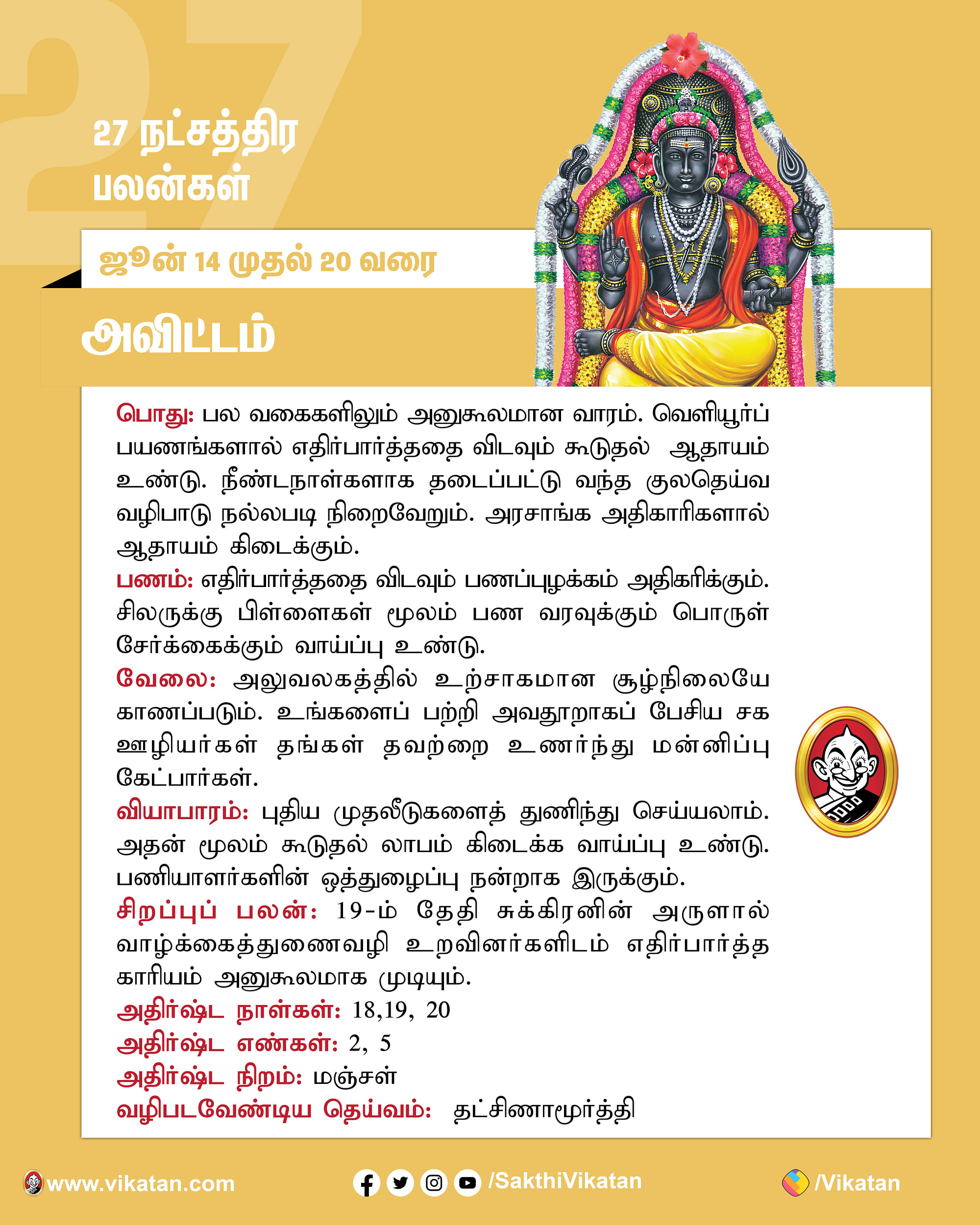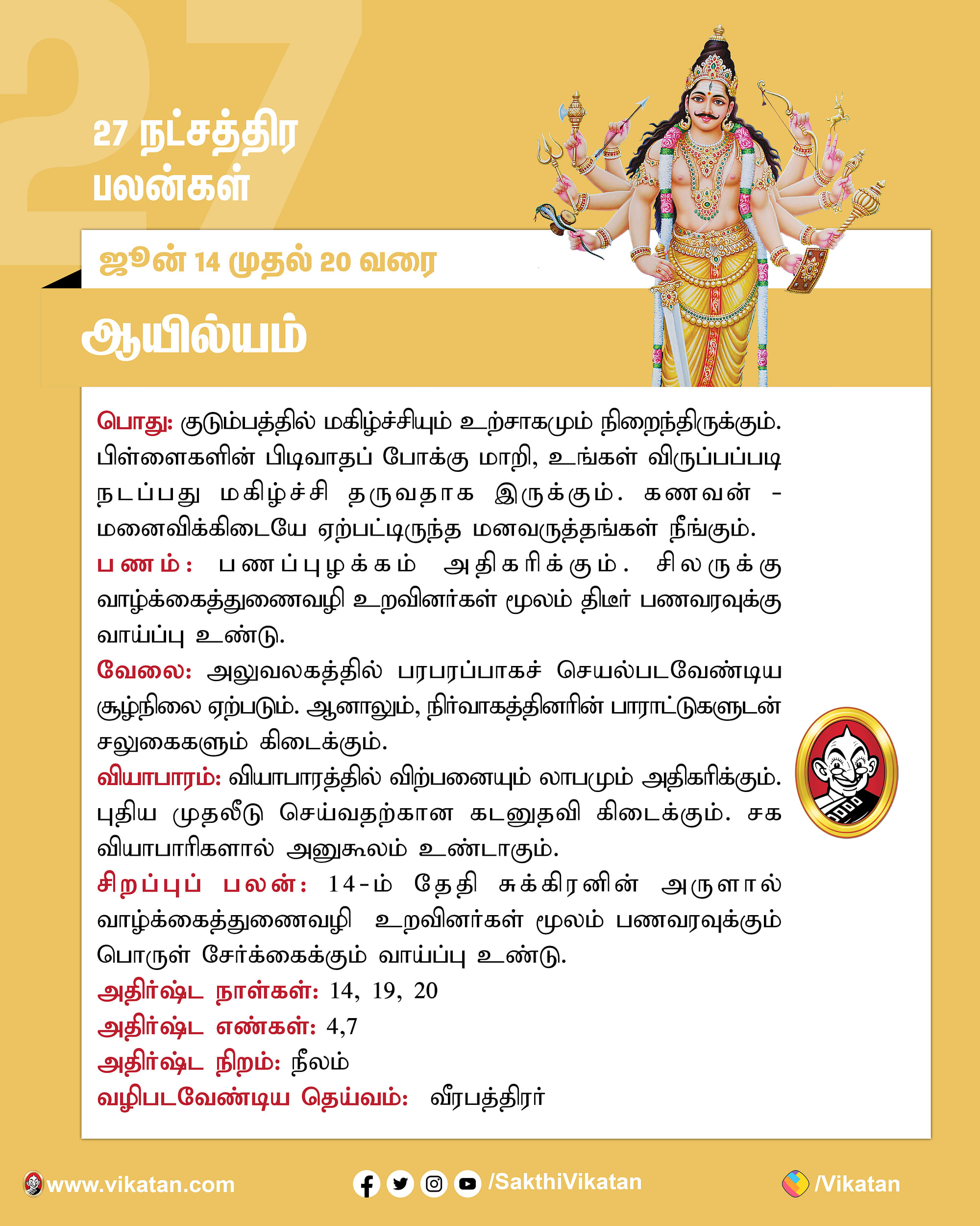 நட்சத்திரப் பலன்கள்: ஜூன் 14 முதல் 20 வரை #VikatanPhotoCards June 14, 2024 by விகடன் அசுவினி பரணி கிருத்திகை ரோகிணி மிருகசீரிடம் திருவாதிரை புனர்பூசம் பூசம் ஆயில்யம் மகம் பூரம் உத்திரம் அஸ்தம் சித்திரை சுவாதி விசாகம் அனுஷம் கேட்டை மூலம் பூராடம் உத்திராடம் திருவோணம் அவிட்டம் சதயம் பூரட்டாதி உத்திரட்டாதி ரேவதி Source link