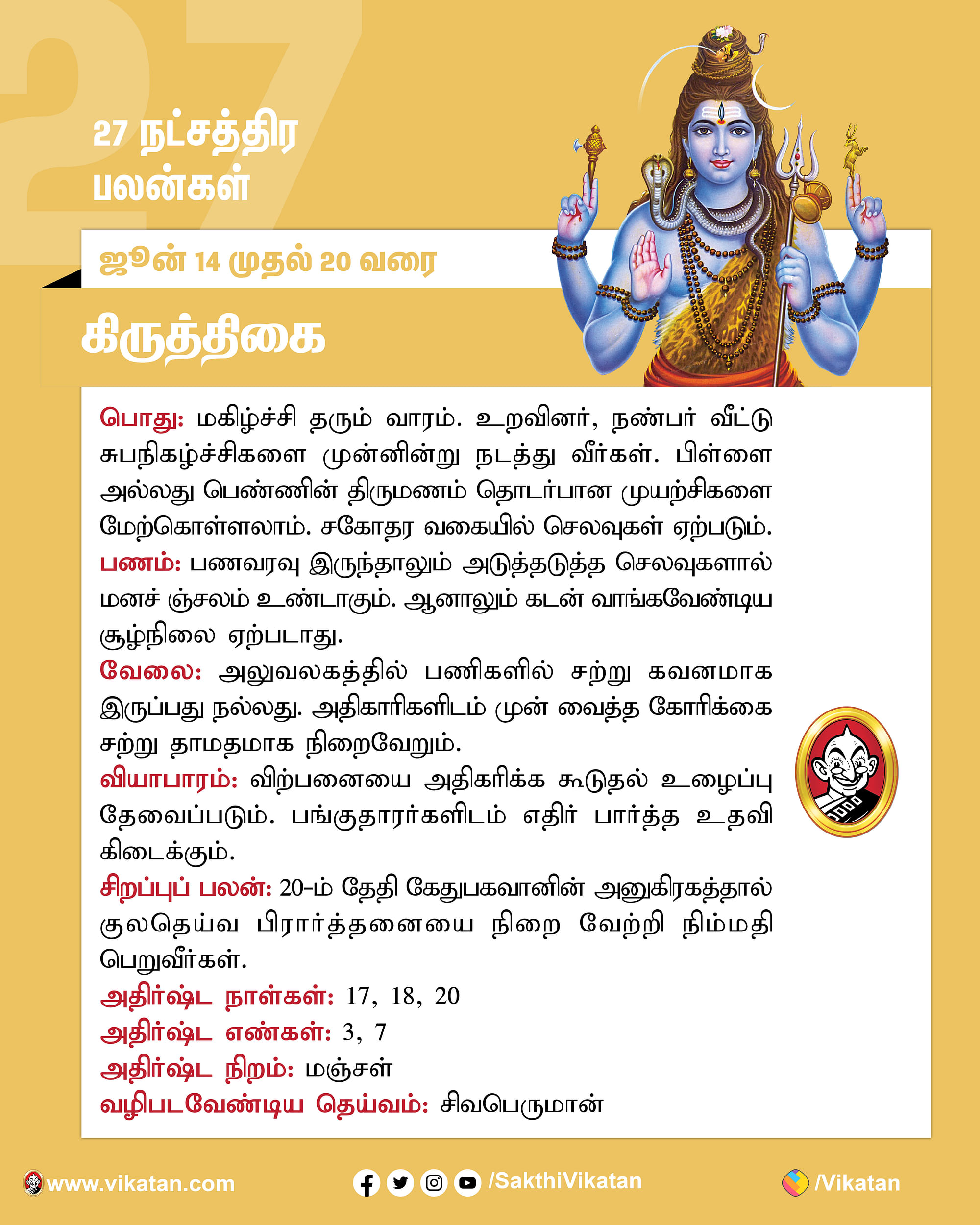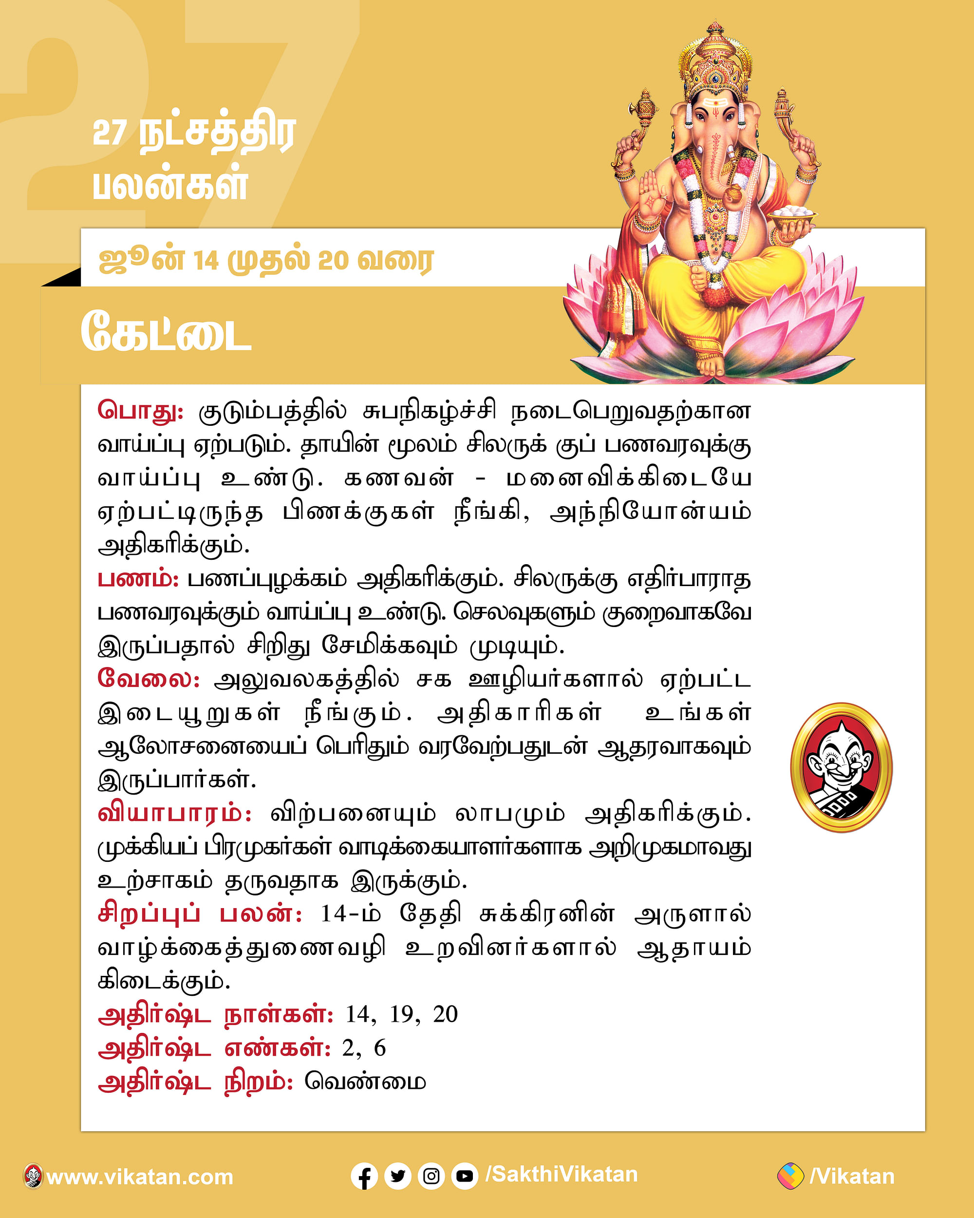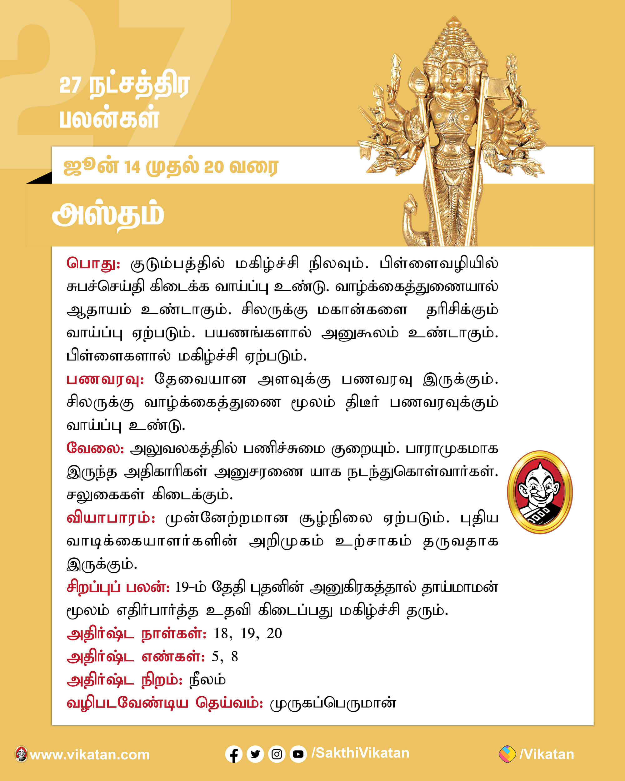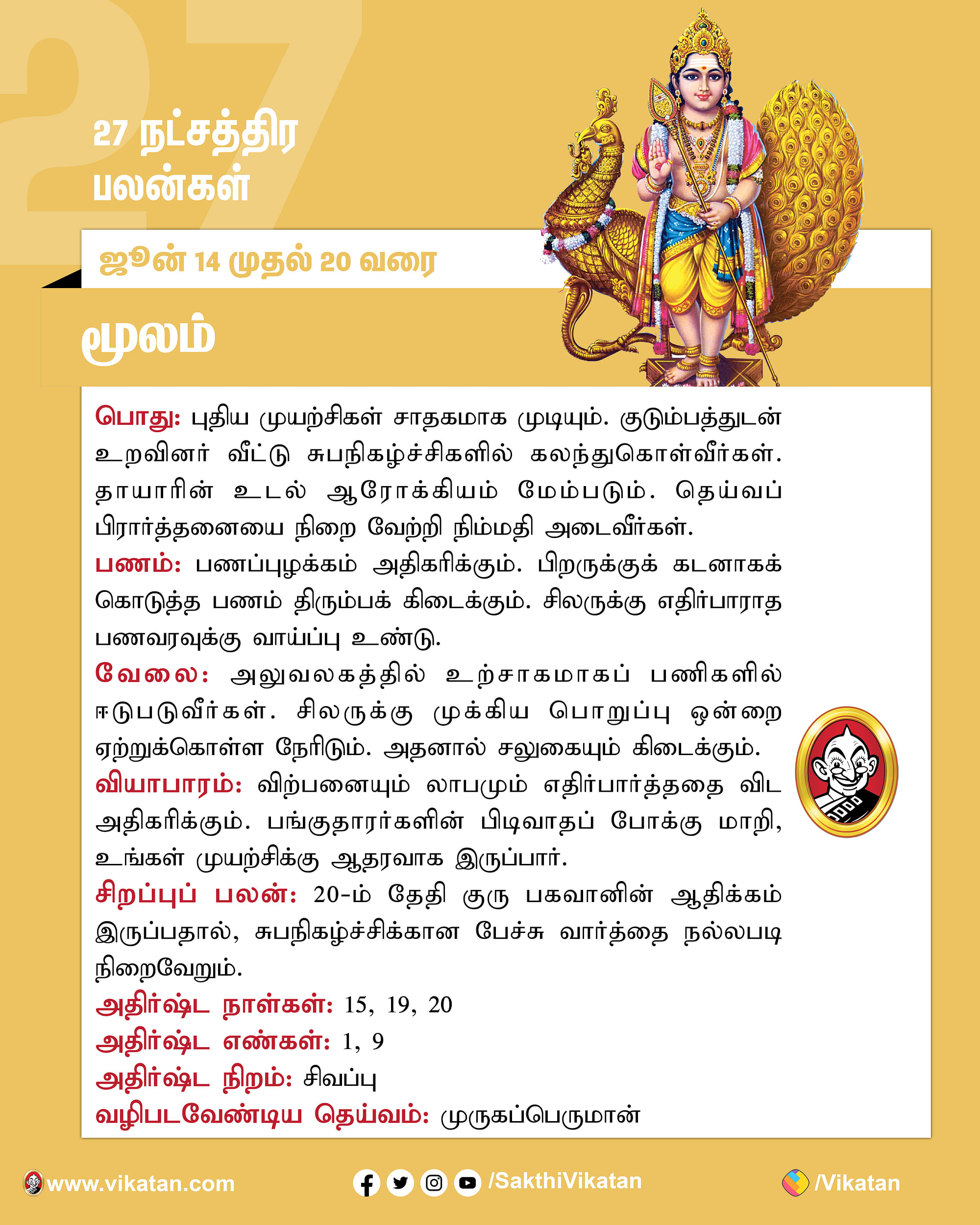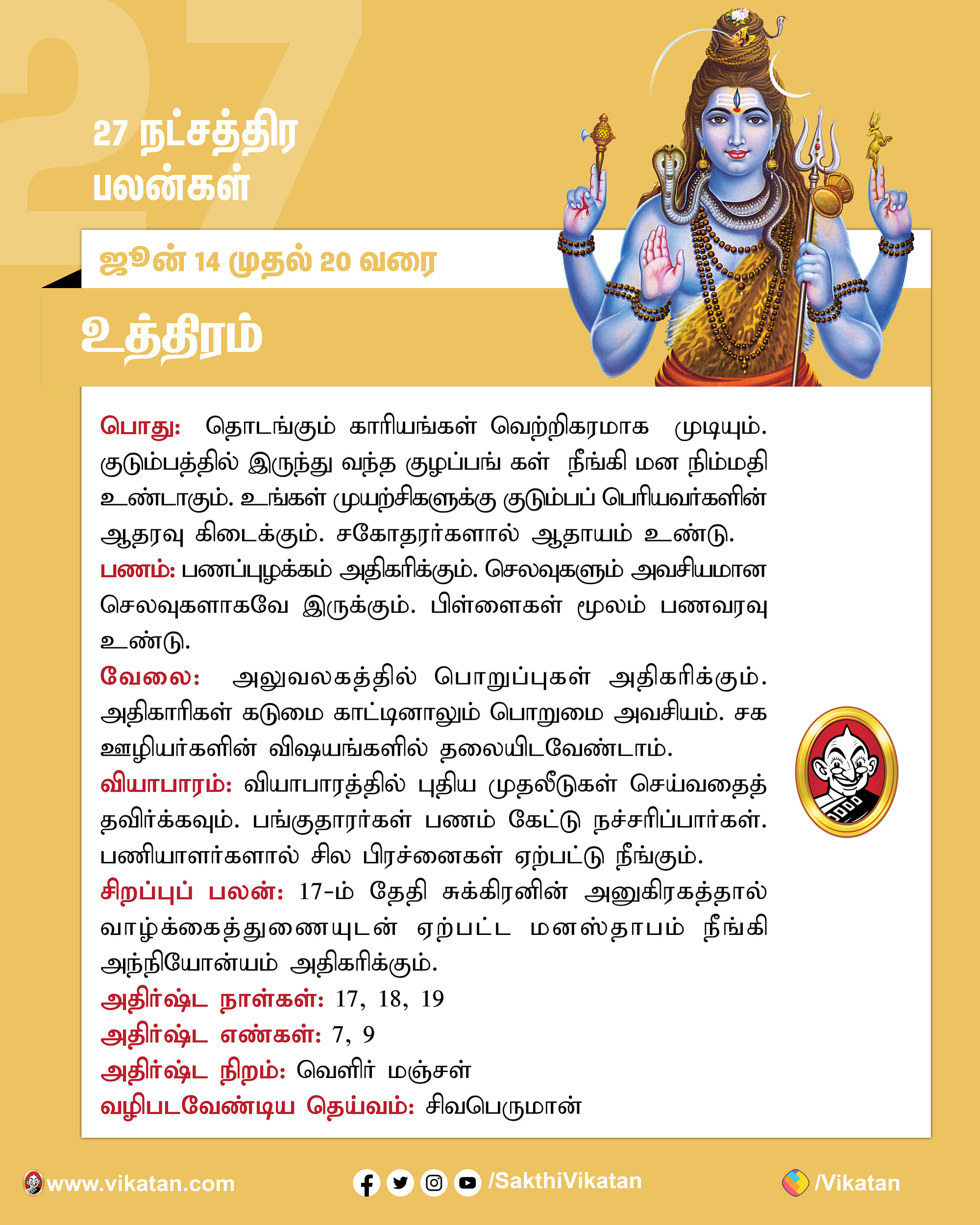 நட்சத்திரப் பலன்கள்: ஜூன் 14 முதல் 20 வரை #VikatanPhotoCards June 14, 2024 by விகடன் அசுவினி பரணி கிருத்திகை ரோகிணி மிருகசீரிடம் திருவாதிரை புனர்பூசம் பூசம் ஆயில்யம் மகம் பூரம் உத்திரம் அஸ்தம் சித்திரை சுவாதி விசாகம் அனுஷம் கேட்டை மூலம் பூராடம் உத்திராடம் திருவோணம் அவிட்டம் சதயம் பூரட்டாதி உத்திரட்டாதி ரேவதி Source link