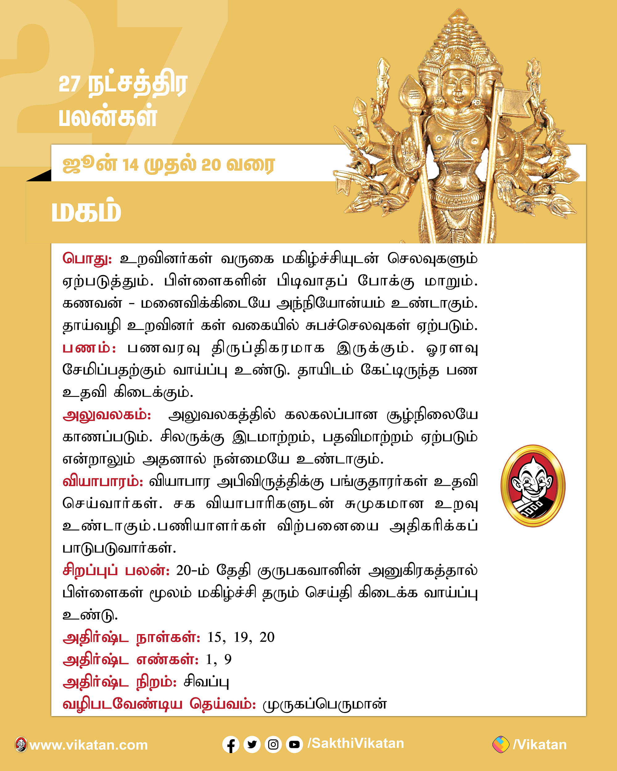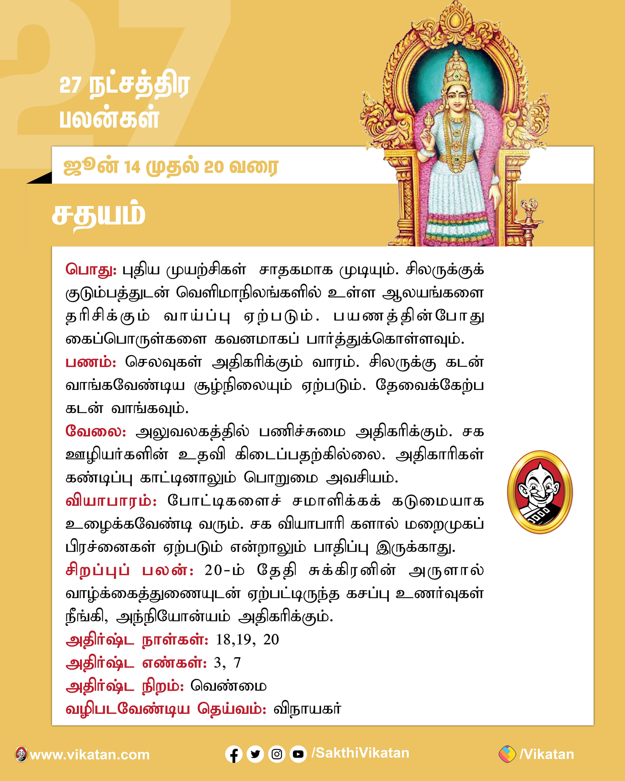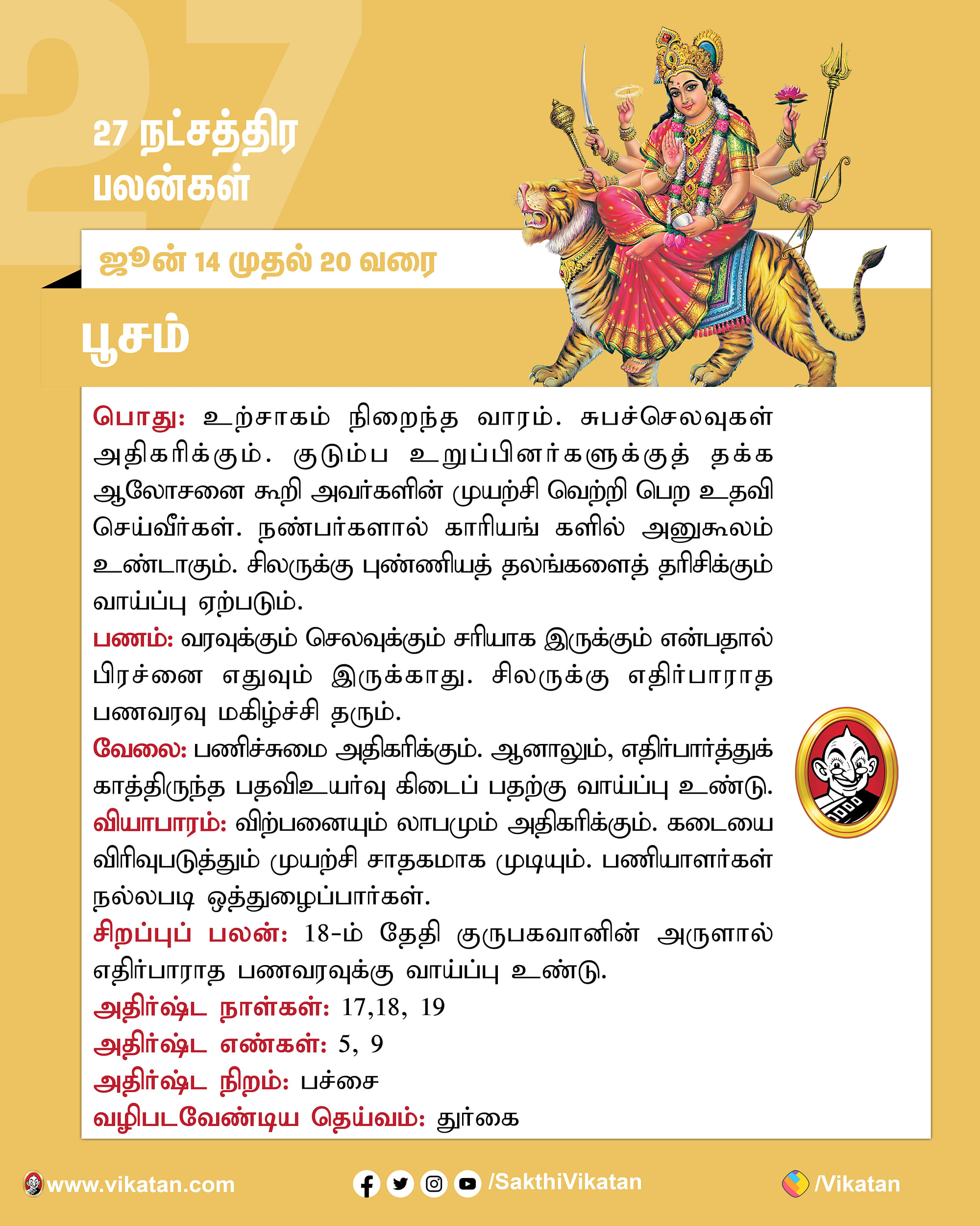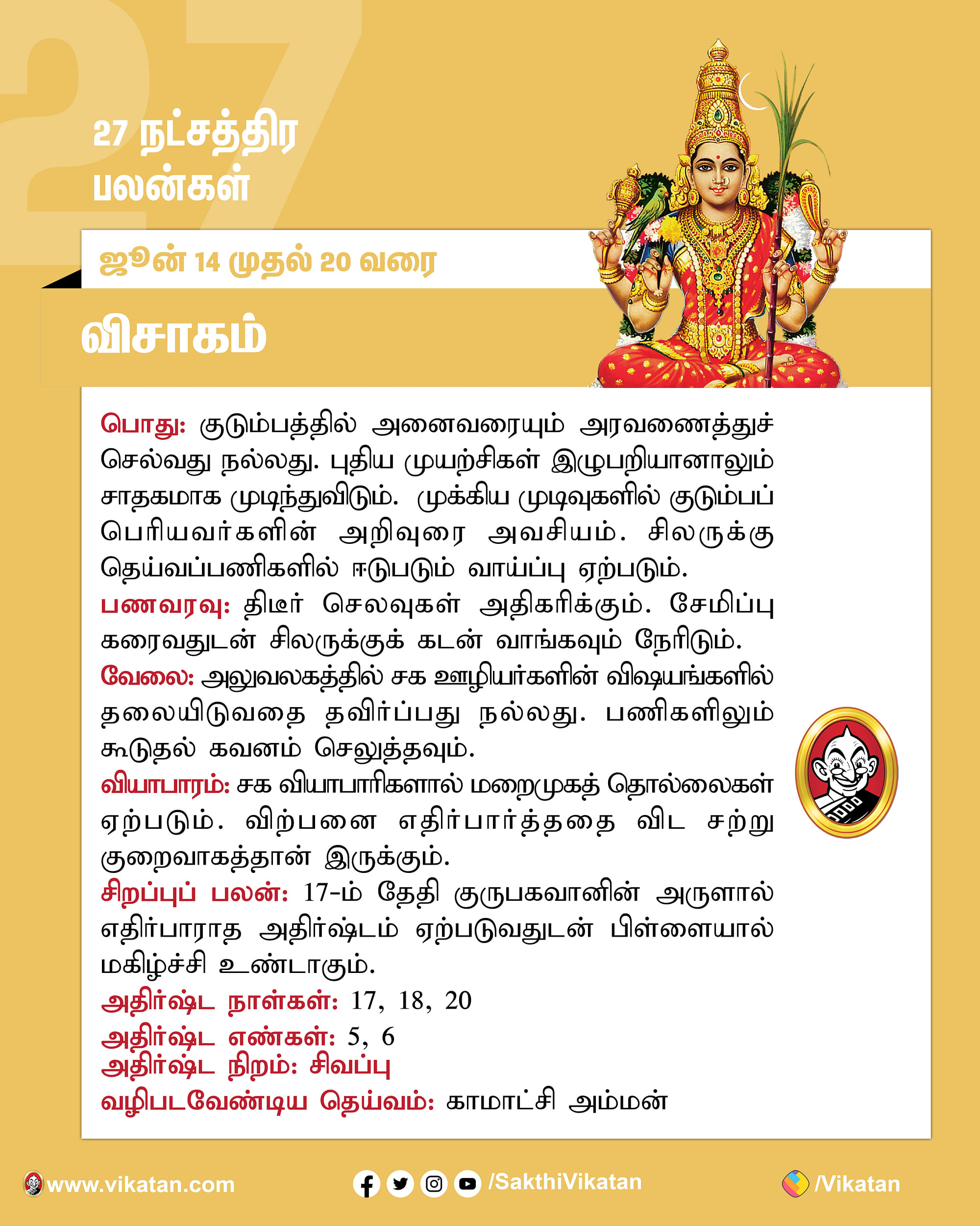 நட்சத்திரப் பலன்கள்: ஜூன் 14 முதல் 20 வரை #VikatanPhotoCards June 14, 2024 by விகடன் அசுவினி பரணி கிருத்திகை ரோகிணி மிருகசீரிடம் திருவாதிரை புனர்பூசம் பூசம் ஆயில்யம் மகம் பூரம் உத்திரம் அஸ்தம் சித்திரை சுவாதி விசாகம் அனுஷம் கேட்டை மூலம் பூராடம் உத்திராடம் திருவோணம் அவிட்டம் சதயம் பூரட்டாதி உத்திரட்டாதி ரேவதி Source link