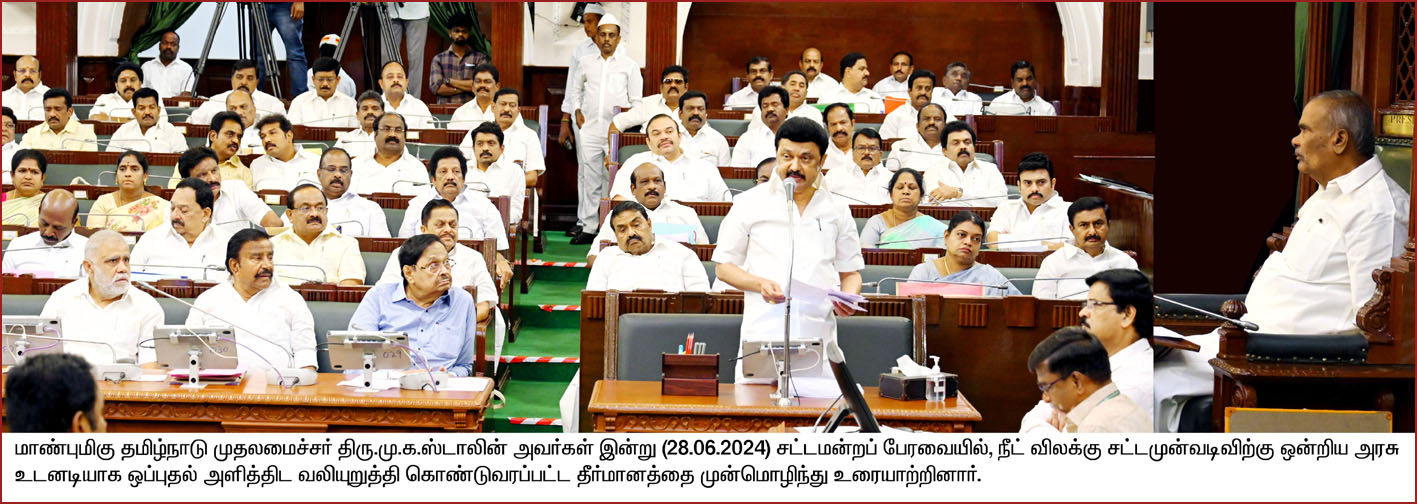 சென்னை: தமிழக சட்டப்பேரவையில் நீட் விலக்கு தீர்மானம் எதிர்க்கட்சியான அதிமுக இன்றி ஒருமனதாக நிறைவேற்றப்பட்டது. தமிழக சட்டசபையில் இன்று நீட் தேர்வு முறைகேடு தொடர்பாக சட்டசபையில் முதலமைச்சர் மு.க.ஸ்டாலின் தனித்தீர்மானம் கொண்டு வந்து உரையாற்றினார். அப்போது, வு ஒழிப்புக்கான அனைத்து நடவடிக்கையையும் தமிழக அரசு எடுக்கும் என்று முதலமைச்ச்ர மு.க.ஸ்டாலின் கூறினார் அதைத்தொடர்ந்து சட்டமன்ற உறுப்பினர்கள் அந்த தீர்மானத்தின்மீது தங்களது கருத்துக்களை பதிவு செய்தனர். இதன்பிறகு தீர்மானத்தின்மீது ஒட்டெடுப்பு நடத்தப்பட்டு, தனித் தீர்மானம் நிறைவேற்றப்பட்டது. சபாநாயகர் அப்பாவு […]