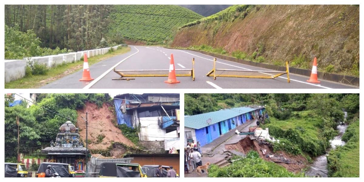 குறிப்பாக தேவிகுளம் அருகே கேப்ரோடு பகுதிகளில் மண்சரிவு அதிகம் உள்ளது. ஆகவே மூணாறு-பூப்பாறை வழித்தட பயணத்துக்கு தற்காலிகமாக தடை விதித்து தேவிகுளம் சார் ஆட்சியர் ஜெயகிருஷ்ணன் உத்தரவிட்டுள்ளார்.டாப் டிவிஷன் தொழிலாளர்கள் குடியிருப்புகளுக்கு அருகே இன்று மண் மற்றும் மின்கம்பங்கள் சரிந்தன. இதனால் மின்விநியோகம் பாதிக்கப்பட்டது.இதே போல் மூணாறில் தேயிலை தோட்ட மண்டல அலுவலகம் அருகே, பழைய மூணாறு உள்ளிட்ட பகுதிகளிலும் மண்சரிவு அபாயம் உள்ளது.