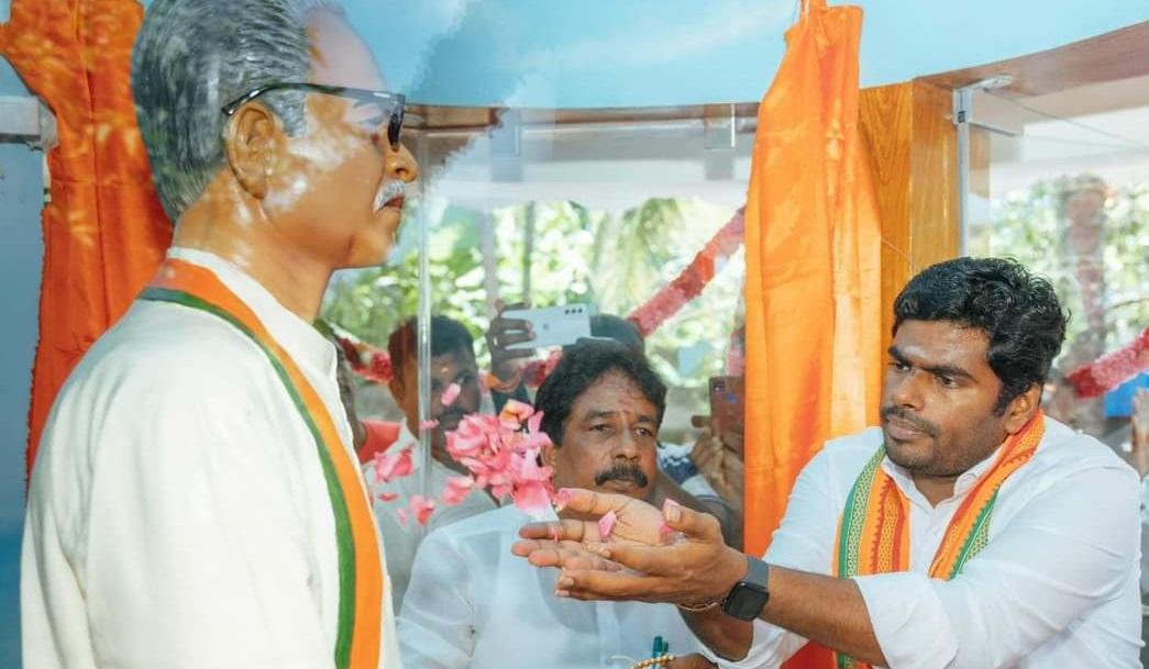 கன்னியாகுமரி மாவட்டம் நாகர்கோவில் அருகே கீழகருப்புக்கோடு பகுதியை சேர்ந்த வேலாயுதன், தென்னிந்தியாவின் முதல் பாஜக எம்எல்ஏவாக இருந்தவர் . குமரி மாவட்டத்தின் வளர்ச்சியிலும் பாஜக கட்சியை வளர்த்ததிலும் பெரும் பங்கு கொண்ட வேலாயுதன் உடல் நலக்குறைவால் சில மாதங்களுக்கு முன்பு உயிரிழந்தார். அவரது இல்லத்தில் வேலாயுதன் உருவச்சிலை மற்றும் மணிமண்டப திறப்பு விழா நிகழ்ச்சி இன்று (ஜூலை 23) நடைபெற்றது. இதில் தமிழக பாஜக மாநில தலைவர் அண்ணாமலை கலந்துகொண்டு மணிமண்டபத்தை திறந்து வைத்து, அவரது சிலைக்கு மரியாதை செலுத்தினார்.
