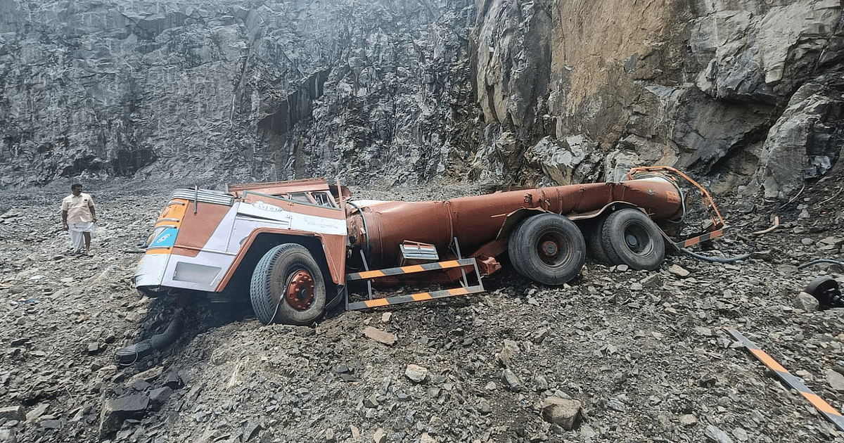 கரூர் மாவட்டம், க.பரமத்தி சுற்றுவட்டார பகுதியில் 100-க்கும் மேற்பட்ட கல்குவாரிகள் செயல்பட்டு வருகிறன. இப்பகுதியில் ஒரு சில கல்குவாரிகள் அரசு நிர்ணயம் செய்த அளவைவிட கூடுதலான அளவு பள்ளம் தோண்டி பாறைகளை வெட்டி எடுத்து, கட்டுமானத்துக்கு தேவையான எம்.சாண்ட், பி.சாண்ட் மணல்களாக மாற்றி விற்பனை செய்து வருகின்றன. இந்நிலையில், தாழையூத்துப்பட்டி பகுதியில் செயல்பட்டு வரும் ஸ்ரீ செல்வ விநாயகா ப்ளூ மெட்டல் கல்குவாரியில் சுற்றுவட்டார பகுதியில் கடந்த இரண்டு நாள்களாக இரவு நேரத்தில் மழை பெய்து வந்த நிலையில், 100 அடி ஆழக்குழியில் 3 அடி அளவில் தண்ணீர் தேங்கி உள்ளது. இதை எடுப்பதற்காக நாகப்பட்டினம் ஆயங்குடி பள்ளம் பகுதியைச் சேர்ந்த சுதாகர் (வயது: 41) என்ற ஓட்டுநரை பாதுகாப்பு உபகரணங்கள் எதுவும் இன்றி பணியில் ஈடுபடுத்தி உள்ளனர். தண்ணீரை எடுப்பதற்காக 22,000 லிட்டர் கொள்ளளவு கொண்ட லாரியில் தண்ணீர் நிரப்பி, அந்த டேங்கர் லாரியை இயக்கி மேலே வந்து கொண்டிருந்தபோது, எதிர்பாராத விதமாக 75 அடி உயரத்திலிருந்து லாரி பாறைக்குள் கவிழ்ந்து விபத்துக்குள்ளானது.
