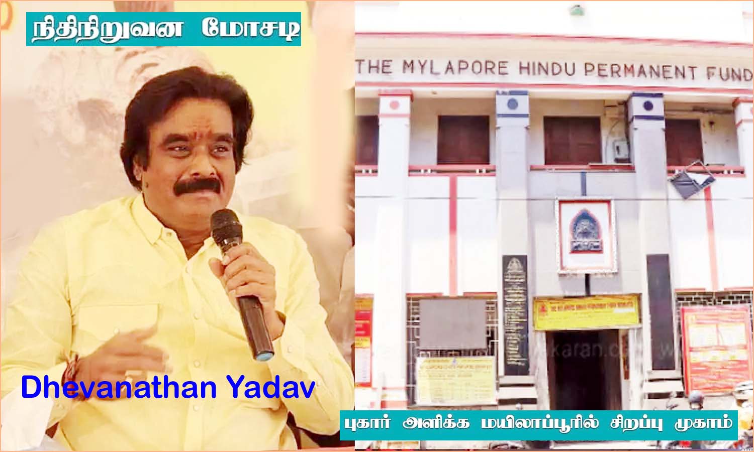 சென்னை: ‘தி மயிலாப்பூர் இந்து பெர்மனெட் ஃபண்ட்’ நிதி நிறுவனம் நடத்தி வந்த தேவநாதன் யாதவ் கைது செய்யப்பட்டுள்ள நிலையில், அந்த நிதி நிறுவனத்தில் பணம் முதலீடு செய்தவர்கள் புகார் அளிக்கலாம் என அறிவிக்கப்பட்டு உள்ளது. இந்த நிதி நிறுவனத்தின் மோசடியால் பாதிக்கப்பட்டவர்கள் புகார் அளிக்க மயிலாப்பூரில் சிறப்பு முகாம் ஏற்பாடு செய்யப்பட்டு உள்ளது. அங்கு பாதிக்கப் பட்டவர்கள் ஆவணங்களுடன் வந்து புகார் அளிக்கலாம் என அறிவிப்பு வெளியிடப்பட்டு உள்ளது. சென்னை மயிலாப்பூர் தெற்கு மாட வீதியில் […]