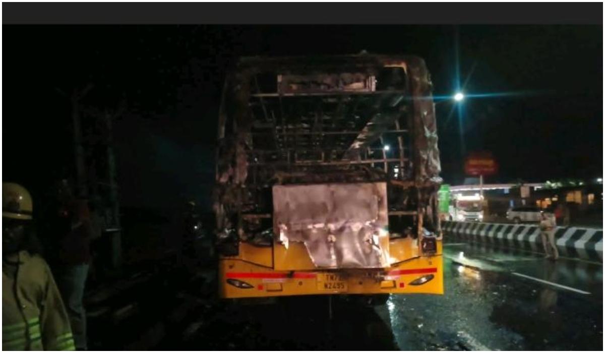 தாராபுரம் புறவழிச் சாலையில் பேருந்து சென்று கொண்டிருந்த போது இன்ஜினில் ஏற்பட்ட கோளாறு காரணமாக இன்ஜின் பகுதியில் தீ பற்றியது. இதையடுத்து உடனடியாக பேருந்தில் இருந்த 52 பயணிகளும் பத்திரமாக கீழே இறக்கப்பட்டனர். அடுத்த சில நிமிடங்களிலேயே பேருந்து மளமளவென தீ பற்றி எரிந்தது.