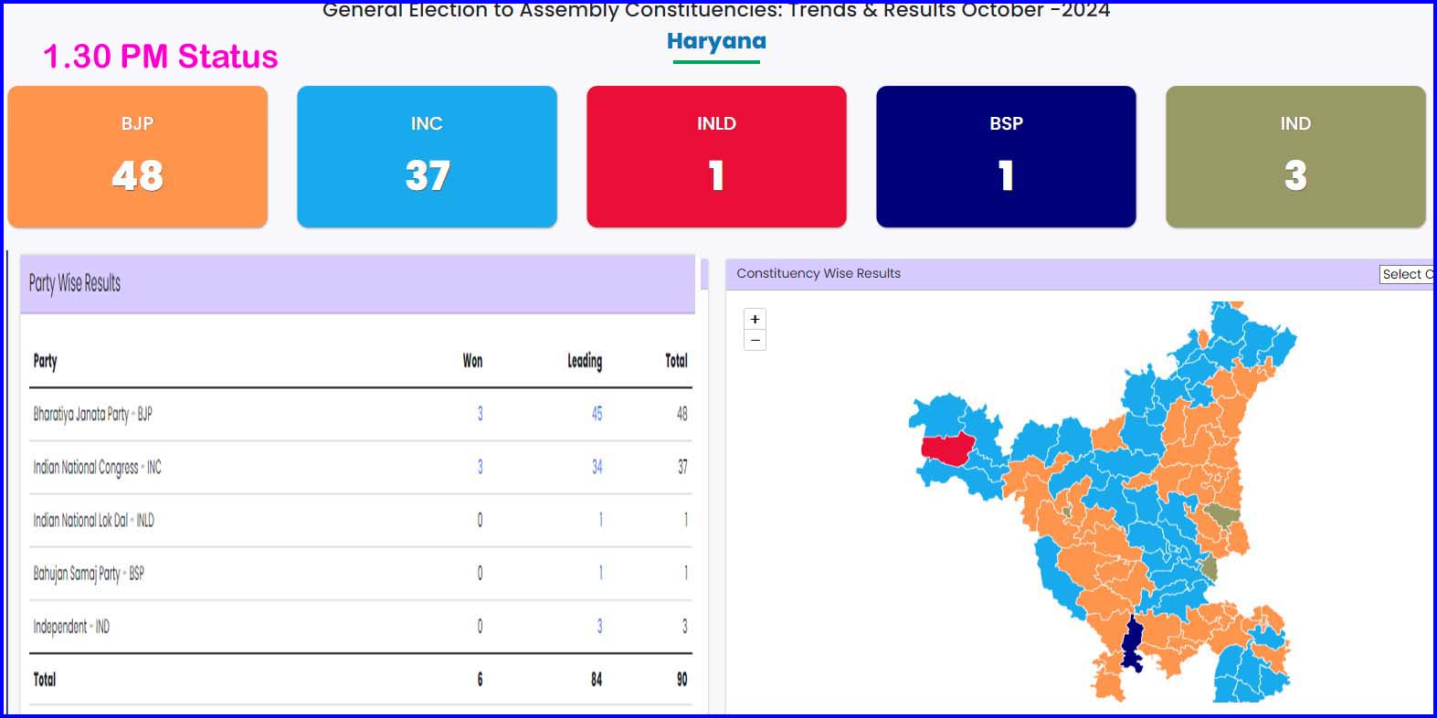 சண்டிகர்: ஆட்சி அமைக்கும் வகையில், பெரும்பான்மை தொகுதிகளில் பாஜக முன்னிலை வகித்து வருகிறது. இதனால், ஹரியானாவில் 3வது முறையாக பாஜக ஆட்சி அமைக்கும் என எதிர்பார்ப்பு எழுந்துள்ளது. 90 தொகுதிகளைக்கொண்ட ஹரியானாவில் சட்டப்பேரவை தேர்தல் ஒரே கட்டமாக கடந்த 5ம் தேதி நடந்தது. இதில், 67.90 சதவீத வாக்குகள் பதிவாகின. இந்த வாக்குகள் இன்று காலை முதல் எண்ணப்பட்டு வருகின்றன. வாக்கு எண்ணிக்கையின்போது, தொடக்கத்தில் காங்கிரஸ் கட்சி ஆதிக்கம் செலுத்தி வந்த நிலையில், பின்னர் பாஜக ஆதிக்கம் […]
