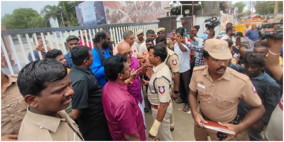 இதனால், இருதரப்புக்கும் இடையே வாக்குவாதம் ஏற்பட்டது. இதையடுத்து சட்டம் ஒழுங்கை கருத்தில் கொண்டு, முன்னெச்சரிக்கை நடவடிக்கையாக, இந்து முன்னணி அமைப்பின் மாநில துணைத் தலைவர் ஜெயக்குமார் மற்றும் அவருடைய ஆதரவாளர்களை போலீஸார் கைது செய்தனர். இந்த சம்பவத்தின் காரணமாக அந்த திரையரங்கில் காட்சிகள் ரத்து செய்யப்பட்டுள்ளது. அங்கு போலீஸார் பாதுகாப்பு பணியில் ஈடுபடுத்தப்பட்டுள்ளனர்.