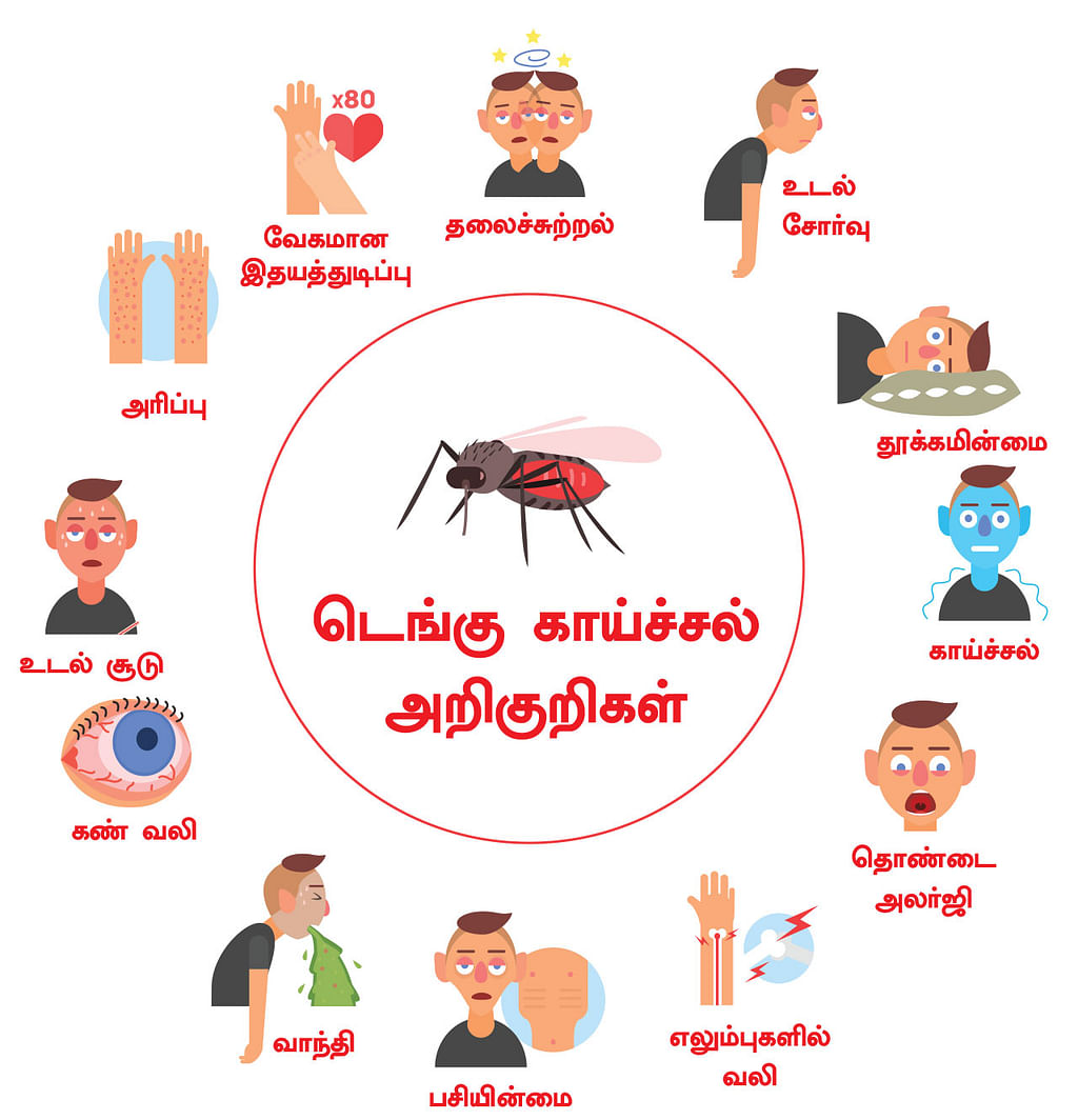 டெங்கு வந்தால், காய்ச்சல் அடிக்கும். கூடவே கண்களுக்குள்ளும் வயிற்றின் மேல் பகுதியிலும் வலி இருக்கும். டெங்கு காய்ச்சல் இரண்டு அல்லது மூன்று நாட்கள் இருந்து, நடுவில் ஒருநாள் இருக்காது. பிறகு மறுபடியும் காய்ச்சல் வரும். இந்தக் காய்ச்சலும் பெரும்பான்மையானவர்களுக்கு பெரியளவில் தொல்லைக் கொடுக்காது. மருத்துவரைப் பார்த்து மாத்திரை எடுத்துக்கொண்டாலே சரியாகி விடும்.