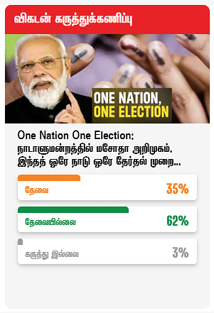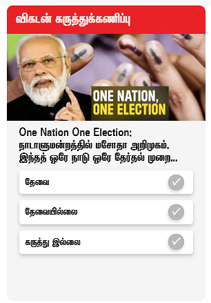 அதில், `ஒரே நாடு ஒரே தேர்தல் முறை…’ என்ற கேள்வி கொடுக்கப்பட்டு, `தேவை, தேவையில்லை, கருத்து இல்லை’ என்ற மூன்று விருப்பங்களும் கொடுக்கப்பட்டிருந்தது. இந்த நிலையில், கருத்துக்கணிப்பு முடிவில் `அதிகபட்சமாக 62 சதவிகிதம் பேர் ஒரே நாடு ஒரே தேர்தல் முறை தேவையில்லை’ என்று தெரிவித்திருக்கின்றனர். 35 சதவிகிதம் பேர் தேவை என்றும், 3 சதவிகிதம் பேர் கருத்து இல்லை என்றும் தெரிவித்திருக்கின்றனர்.