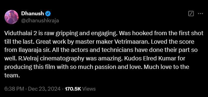 தனுஷின் பதிவில், “விடுதலை 2 ராவான (Raw) பிடிப்புடன் ஈர்க்கக்கூடிய திரைப்படமாக உள்ளது. முதல் ஷாட் முதல் கடைசி ஷாட் வரை படத்துடன் ஒன்றியிருந்தேன். தலைசிறந்த படைப்பாளர் (Master Maker) வெற்றிமாறனின் மிகச்சிறந்த வேலைப்பாடு. இளையராஜா சாரின் இசையை ரசித்தேன். அனைத்து நடிகர்களும் தொழில்நுட்பக் குழுவினரும் தங்களது வேலையை சிறப்பாக செய்திருக்கின்றனர். ஆர்.வேல்ராஜின் ஒளிப்பதிவு அற்புதமாக இருந்தது. மிகுந்த ஆர்வத்துடனும் அன்புடனும் இந்தப் படத்தைத் தயாரித்ததற்காகப் எல்ரெட் குமாருக்கு வாழ்த்துகள். படக்குழுவினருக்கு என் அன்பைப் பகிர்கிறேன்.” எனக் குறிப்பிடிருந்தார்.