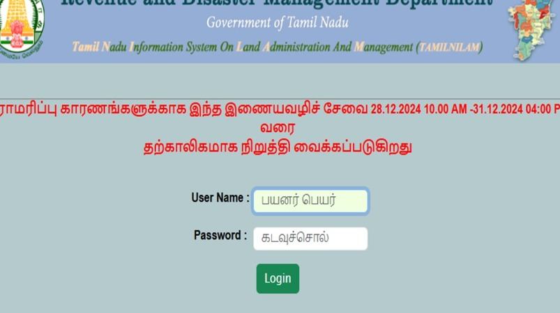 இதன் காரணமாக இன்று (டிச.28) காலை 10 மணி முதல் 31-ம் தேதி மாலை 4 மணி வரை இணையவழி பட்டா மாறுதல் மேற்கொள்ளும் ‘தமிழ்நிலம்’ இணையதளமான https://tamilnilam.tn.gov.in/Revenue/ மற்றும் https://eservices.tn.gov.in/eservicesnew/index.html இணையதளங்கள் தற்காலிகமாக நிறுத்தி வைக்கப்படுகிறது. இவ்வாறு செய்திக்குறிப்பில் கூறப்பட்டுள்ளது.