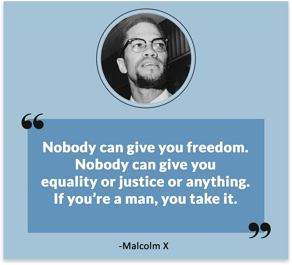 “கூட்டம் கைதட்டி கைதட்டி உற்சாகப்படுத்துவதால், கைதட்டல் ஓயும் வரை மால்கம் அமைதியாக இருக்க வேண்டும். அந்தளவுக்கு மால்கமின் பேச்சை கூட்டத்தினர் ரசித்துக் கேட்பது வழக்கம். எனக்கு நன்றாக நினைவிருக்கிறது, ஒருமுறை அவர் கூறிய வாசகங்கள் இது: Nobody can give you freedom. Nobody can give you equality or justice or anything. If you’re a man, you take it. “உனக்கு யாரும் சுதந்திரத்தை வழங்க முடியாது. சமத்துவத்தையோ நீதியையோ அல்லது வேறு எதையுமோ யாரும் உனக்கு வழங்க முடியாது. நீ மனிதன் என்றால், அதை நீயே எடுத்துக் கொள்ள வேண்டும்” என அவர் சொன்னது இப்போதும் என் நினைவுல இருக்கு.