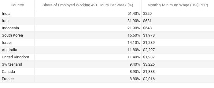 சுவிட்சர்லாந்தில் வெறும் 9.4% பேர்தான் 49 மணிநேரத்துக்கு மேல் பணியாற்றுகின்றனர். ஆனால் அங்குள்ள தொழிலாளர்களுக்கான குறைந்தபட்ச ஊதியம் 2,78,066 ரூபாய்.