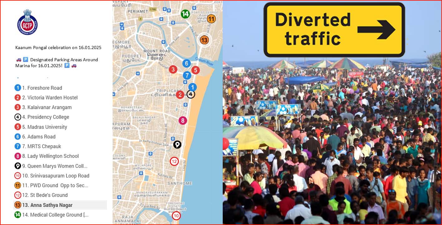 சென்னை: காணும் பொங்கலையொட்டி, சென்னை மெரினா உள்பட சுற்றுலா ஸ்தலங்களில் மக்கள் அதிக அளவில் கூடுவார்கள் என்பதால், சென்னை கடற்கரை சாலை உள்பட சில பகுதிகளில் போக்குவரத்து மாற்றம்  செய்யப்பட்டு உள்ளது. மேலும் கடற்கரையில் குளிக்க தடை விதிக்கப்பட்டுள்ளதுடன், 16ஆயிரம் போலீசார் பாதுகாப்பு பணியில் ஈடுபடுத்தப்படுகிறார்கள். ஜனவரி 16 ஆம் தேதி காணும் பொங்கலையொட்டி சென்னை  கடற்கரை காமராஜர் சாலையில் போக்குவரத்து மாற்றங்கள் செய்து சென்னை மாநகர போக்குவரத்து காவல்துறை அறிவிப்பு வெளியிட்டு உள்ளது. இதுகுறித்து சென்னை […]