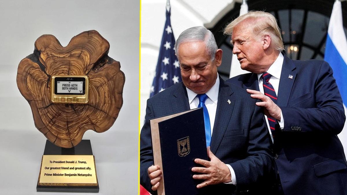 வெட்டப்பட்ட மரத்தில் ட்ரம்புக்கு பரிசளித்த பேஜர் வைக்கப்பட்டுள்ளது. அதில் ‘பிரஸ் வித் போத் ஹேண்ட்ஸ்’ என்ற மெசேஜ் இருக்கிறது. அதன் கீழே ‘எங்களின் தலைசிறந்த நண்பர் மற்றும் சிறந்த கூட்டாளியுமான அதிபர் டொனால்ட் ஜே.ட்ரம்புக்கு, பிரதமர் பெஞ்சமின் நெதன்யாகு’ என குறிப்பிடப்பட்டுள்ளது.