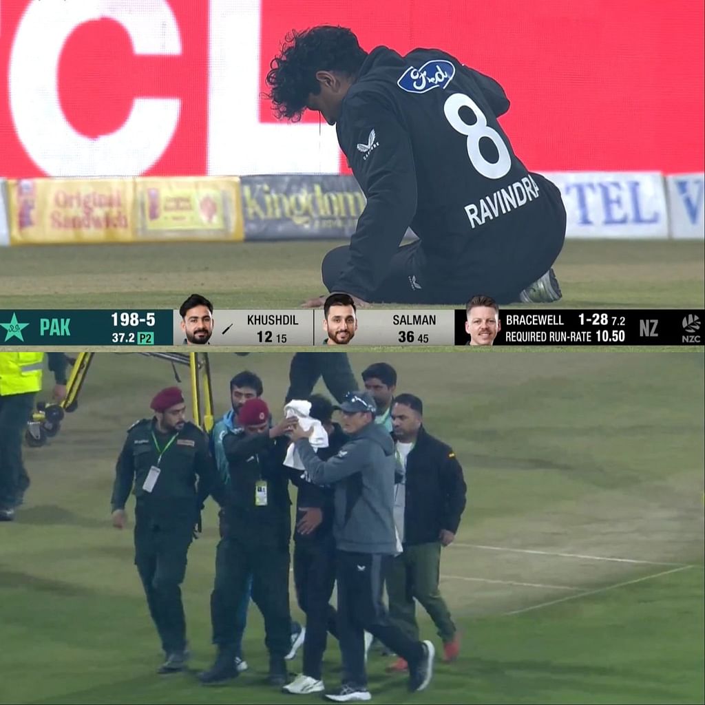 பாகிஸ்தானில் சுற்றுப்பயணம் மேற்கொண்டுள்ள நியூசிலாந்து அணி, பாகிஸ்தானுடன் முத்தரப்பு ஒரு நாள் தொடரில் விளையாடி வருகிறது. முதல் போட்டியில் பாகிஸ்தான் மற்றும் நியூசிலாந்து அணிகள் மோதின. நியூசிலாந்து அணி முதலில் பேட்டிங் செய்து 50 ஓவர்களில் 330 ரன்கள் எடுத்தது. அடுத்து பாகிஸ்தான் அணி பேட்டிங் செய்தது. நியூசிலாந்து கிரிக்கெட் அணியின் ஆல்ரவுண்டர் ரச்சின் ரவீந்திரா, பாகிஸ்தான் வீரர் குஷ்தில் ஷா அடித்தப் பந்தைக் கேட்ச் பிடிக்கச் சென்றார். அப்போது பந்து அவர் முகத்தில் தாக்கி பலத்த காயமடைந்து கீழே விழுந்தார். உடனே மருத்துவர்களின் குழு மைதானத்துக்குள் நுழைந்து, அவருக்கு முதலுதவி அளித்து அவரை பாதுகாப்பாக மைதானத்தை விட்டு அழைத்துச் சென்றனர்.