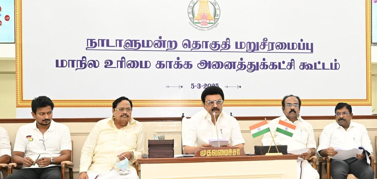 இந்த கூட்டத்தில் முதல்வர் மு.க.ஸ்டாலின் பேசியதாவது: அனைத்து வளர்ச்சிக் குறியீடுகளிலும், முதன்மை மாநிலமாக இருக்கக்கூடிய தமிழகத்தில் தற்போது மொத்தம் 39 நாடாளுமன்ற தொகுதிகள் உள்ளன. இந்த சூழ்நிலையில் தொகுதி மறுசீரமைப்பின் காரணமாக நாடாளுமன்ற தொகுதிகளின் எண்ணிக்கை குறையும் அபாயம் ஏற்பட்டுள்ளது. அவ்வாறு குறைக்கப்படும் நிலையில், தமிழகம் மிக கடுமையாக பாதிக்கப்படும். மத்திய அரசு 2026-ம் ஆண்டில், மக்களவைத் தொகுதிகளின் எண்ணிக்கையை மறுசீரமைப்பு செய்ய உள்ளதாகவும், பொதுவாக தொகுதி மறுசீரமைப்பு என்பது மக்கள் தொகை கணக்கீட்டினை அடிப்படையாகக் கொண்டுதான் மேற்கொள்ளப்படும் எனவும் தெரிகிறது. பல பத்தாண்டுகளாக வெற்றிகரமான குடும்ப கட்டுப்பாடு திட்டங்கள், பெண்கள் கல்வி மற்றும் சுகாதார முன்முயற்சிகள் மூலமாக நம் மாநிலத்தின் மக்கள் தொகை குறைவாக இருக்கிறது. தமிழகத்தில் தற்போதுள்ள மக்கள் தொகையின் அடிப்படையில் நாடாளுமன்ற தொகுதி மறுசீரமைப்பு செய்யப்பட்டால் நமது பிரதிநிதித்துவம் குறையும்.