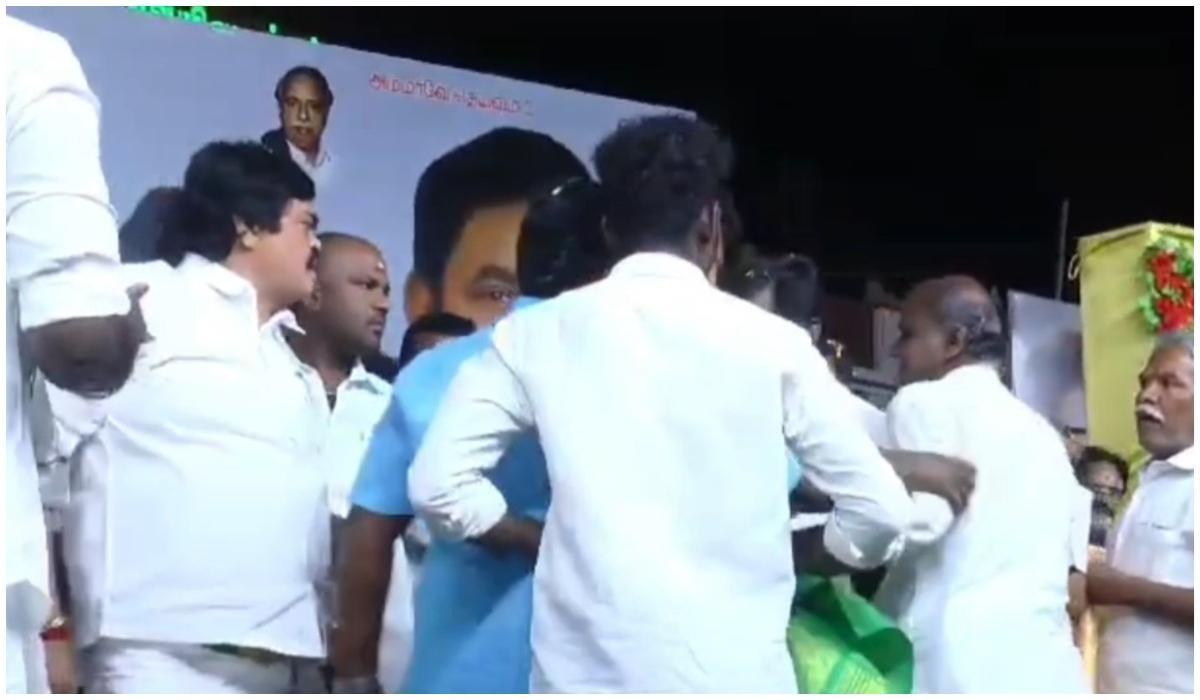 விருதுநகர் பாண்டியன் நகரைச் சேர்ந்த, கிழக்கு ஒன்றிய எம்ஜிஆர் மன்ற துணைச் செயலாளர் நந்தகுமார் (52) பொன்னாடை அணிவிக்க வந்தார். ராஜேந்திர பாலாஜிக்கு பொன்னாடை அணிவித்துவிட்டு, அருகே அமர்ந்திருந்த பாண்டியராஜனுக்கு பொன்னாடை அணிவிக்கச் சென்றார். அப்போது, திடீரென தனது இருக்கையிலிருந்து எழுந்த ராஜேந்திர பாலாஜி, “யார் மாவட்டச் செயலாளர் எனத் தெரியாதா?’ எனக் கேட்டவாறு நந்தகுமார் கன்னத்தில் அறைந்தார். அங்கிருந்த கட்சி நிர்வாகிகள் உடனடியாக நந்தகுமாரை மேடையிலிருந்து இறக்கி, அழைத்துச் சென்றனர். தொடர்ந்து கூட்டம் நடைபெற்றது. இச்சம்பவம் அதிமுகவினரிடையே சலசலப்பை ஏற்படுத்தியுள்ளது. இது குறித்து கருத்து கேட்பதற்காக ராஜேந்திர பாலாஜியை தொடர்புகொண்டபோது, அவர் செல்போன் அழைப்பை ஏற்கவில்லை.