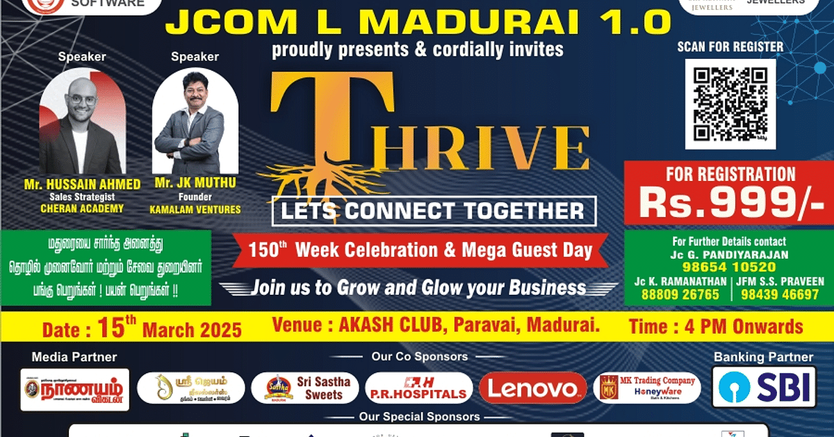 அந்த வகையில் JCOM L MADURAI 1.0 சார்பில் தங்களின் 150-வது வார விழாவை THRIVE என்ற பெயரில் மார்ச் 15 ஆம் தேதி மதுரை பரவையிலுள்ள ஆகாஷ் கிளப்பில் நடத்துகிறது.