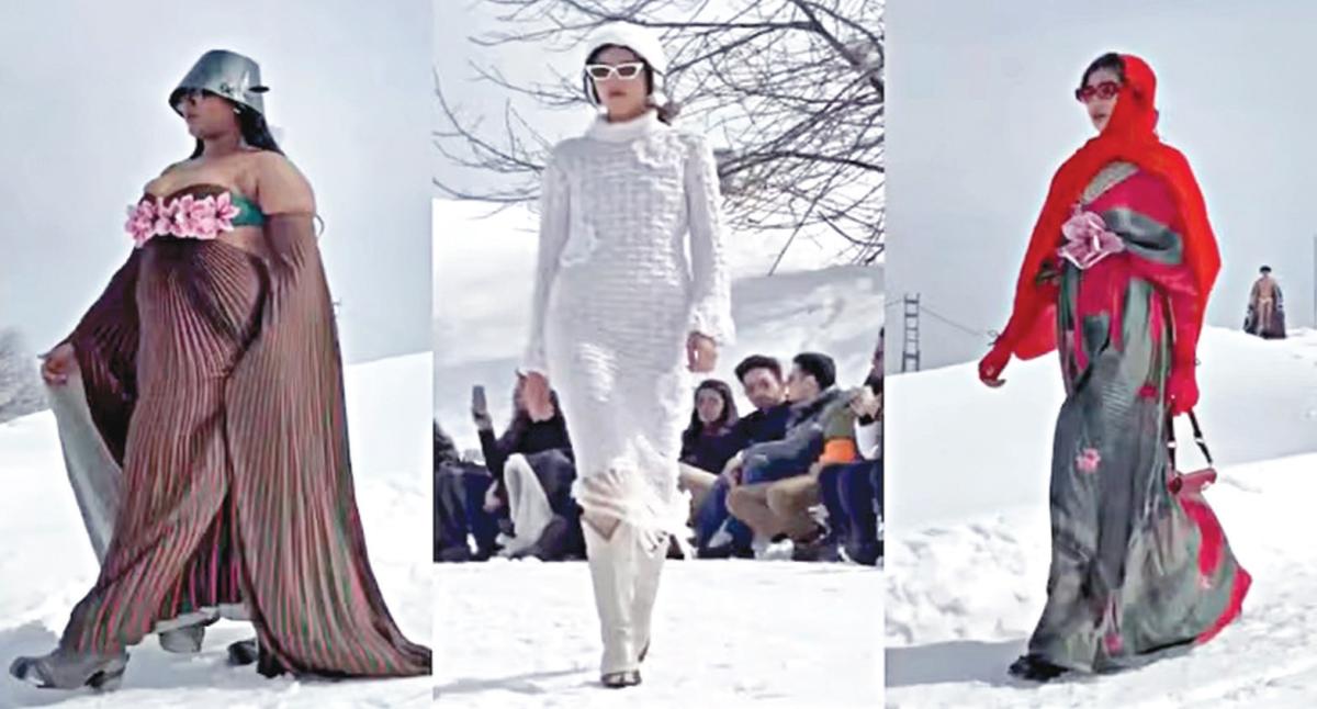 காஷ்மீரின் புகழ்பெற்ற சுற்றுலா தலமான குல்மார்க்கில் தற்போது பழிப்பொழிவு அதிகரித்து உள்ளது. பனிசூழ்ந்த குல்மார்க் மலைப்பகுதியில் திறந்தவெளியில் கடந்த 8-ம் தேதி ஆடை அணிவகுப்பு நடத்தப்பட்டது. இதில் ஆடை வடிவமைப்பாளர்கள் ஷிவம், நரேஷ் ஆகியோரின் ஆடைகள் அறிமுகம் செய்யப்பட்டன. முன்னணி மாடல்கள் பங்கேற்று ஆடைகளை அறிமுகம் செய்தனர்.