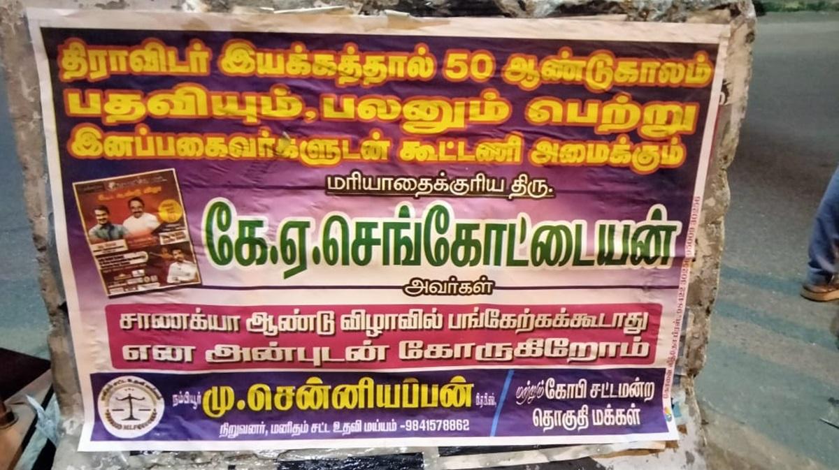 அந்த போஸ்டர்களில் ‘திராவிடர் இயக்கத்தால் 50 ஆண்டுகள் பதவியும் பலனும் பெற்று இனப் பகைவர்களுடன் கூட்டணி அமைக்கும் அதிமுக முன்னாள் அமைச்சர் கே.ஏ.செங்கோட்டையன் நிகழ்ச்சியில் பங்கேற்கக் கூடாது’ என குறிப்பிடப்பட்டுள்ளது. இந்த போஸ்டரில் நம்பியூர் மு.சென்னியப்பன், மனிதம் சட்ட உதவி மையம் மற்றும் தொகுதி மக்கள் சார்பில் அன்புடன் கோருகிறோம் எனவும் குறிப்பிடப்பட்டுள்ளது.