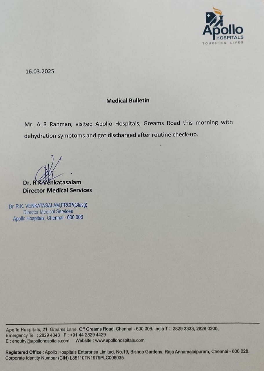 ஏ.ஆர்.ரஹ்மான் உடல்நிலை குறித்து அப்போலோ மருத்துவமனை வெளியிட்டுள்ள அறிக்கையில், “இன்று காலையில் நீரிழப்பு காரணமாக ஏ.ஆர்.ரஹ்மான் கிரீம்ஸ் சாலையில் உள்ள அப்போலோ மருத்துவமனையில் அனுமதிக்கப்பட்டுள்ளார். வழக்கமான பரிசோதனைகளுக்குப் பின்னர், டிஸ்சார்ஜ் செய்யப்பட்டார்” என்று கூறப்பட்டுள்ளது.