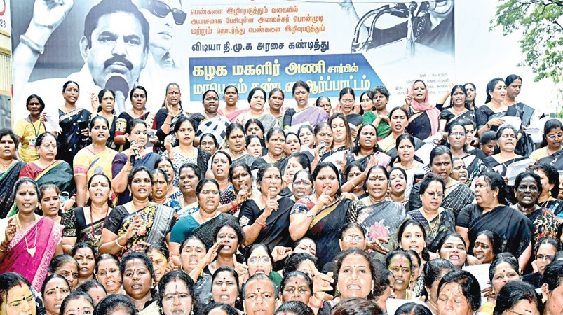 அதன்படி, சென்னை சைதாப்பேட்டை பனகல் மாளிகை அருகே அதிமுக மகளிரணியினர் கருப்பு சேலை அணிந்து ஆர்ப்பாட்டத்துக்கு வந்திருந்தனர். அமைச்சர் பொன்முடி பொதுவெளியில் மன்னிப்பு கேட்க வேண்டும், அவரை கைது செய்ய வேண்டும் என்பன உள்ளிட்ட வாசகங்கள் அடங்கிய பதாகைகளை ஏந்தி ஆர்ப்பாட்டத்தில் ஈடுபட்டனர்.
