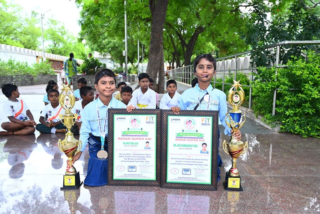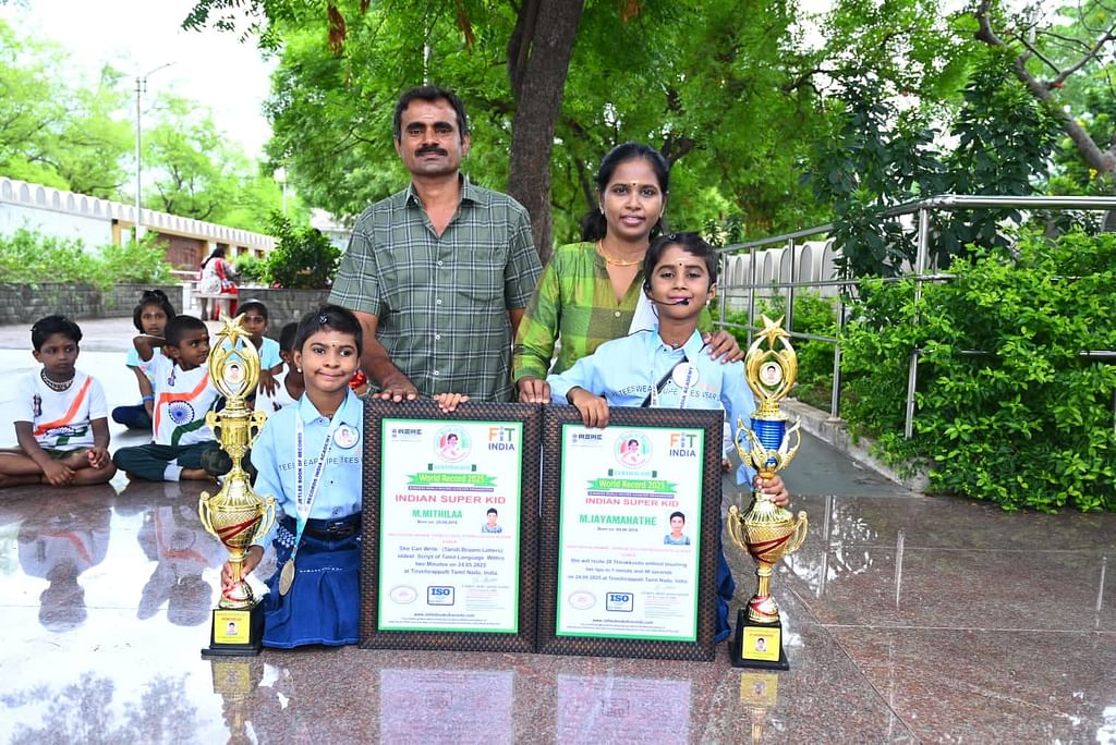 இவர்களின் மூத்த பெண் குழந்தை மிதிலா ஒரு நிமிடம் 35 வினாடிகளில் 52 தமிழி (பிராமி) எழுத்துகளை எழுதி அசத்தி உள்ளார். இரண்டாவது பெண் குழந்தை ஜெயமகதி அதே ஒரு நிமிடம் 35 வினாடிகளில் 20 உதடு ஒட்டாத திருக்குறள்களை ஒப்புவித்து அசத்தி உள்ளார்.